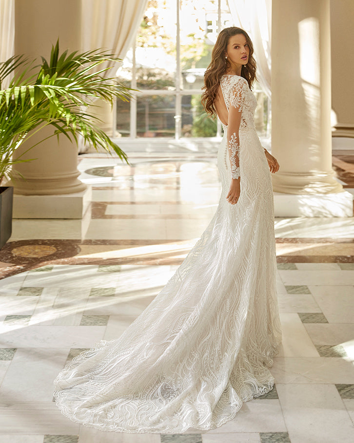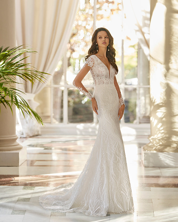 Youthful mermaid-style wedding dress, entirely made of lace embellished with beadwork appliqués. Aire Barcelona dress with a V-neckline, an open back, and long sleeves with beadwork appliqués.