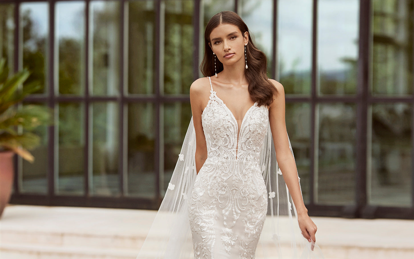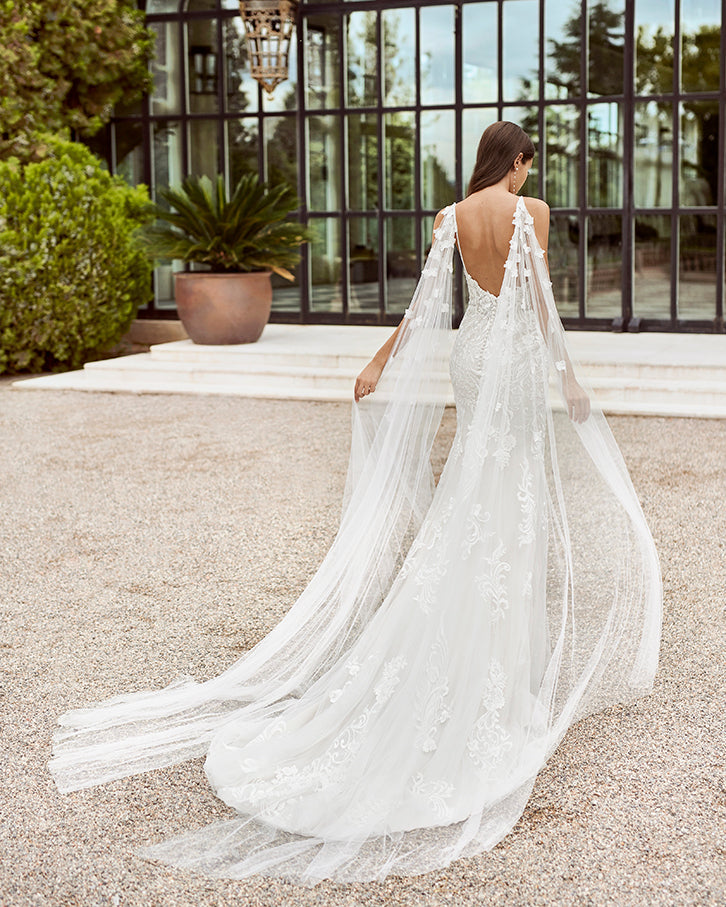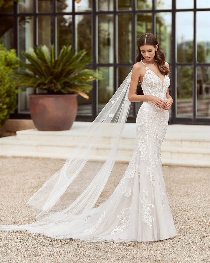Sexy mermaid-style wedding dress made of embroidered lace; with a deep-plunge neckline and open back. embellished with beadwork, and a glitter skirt.