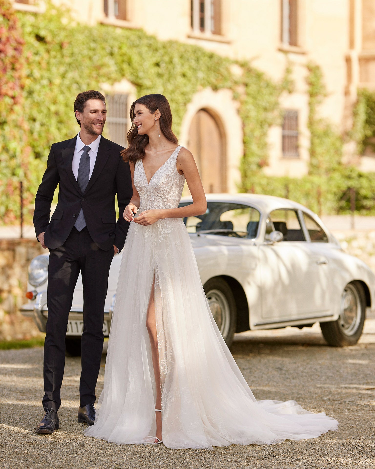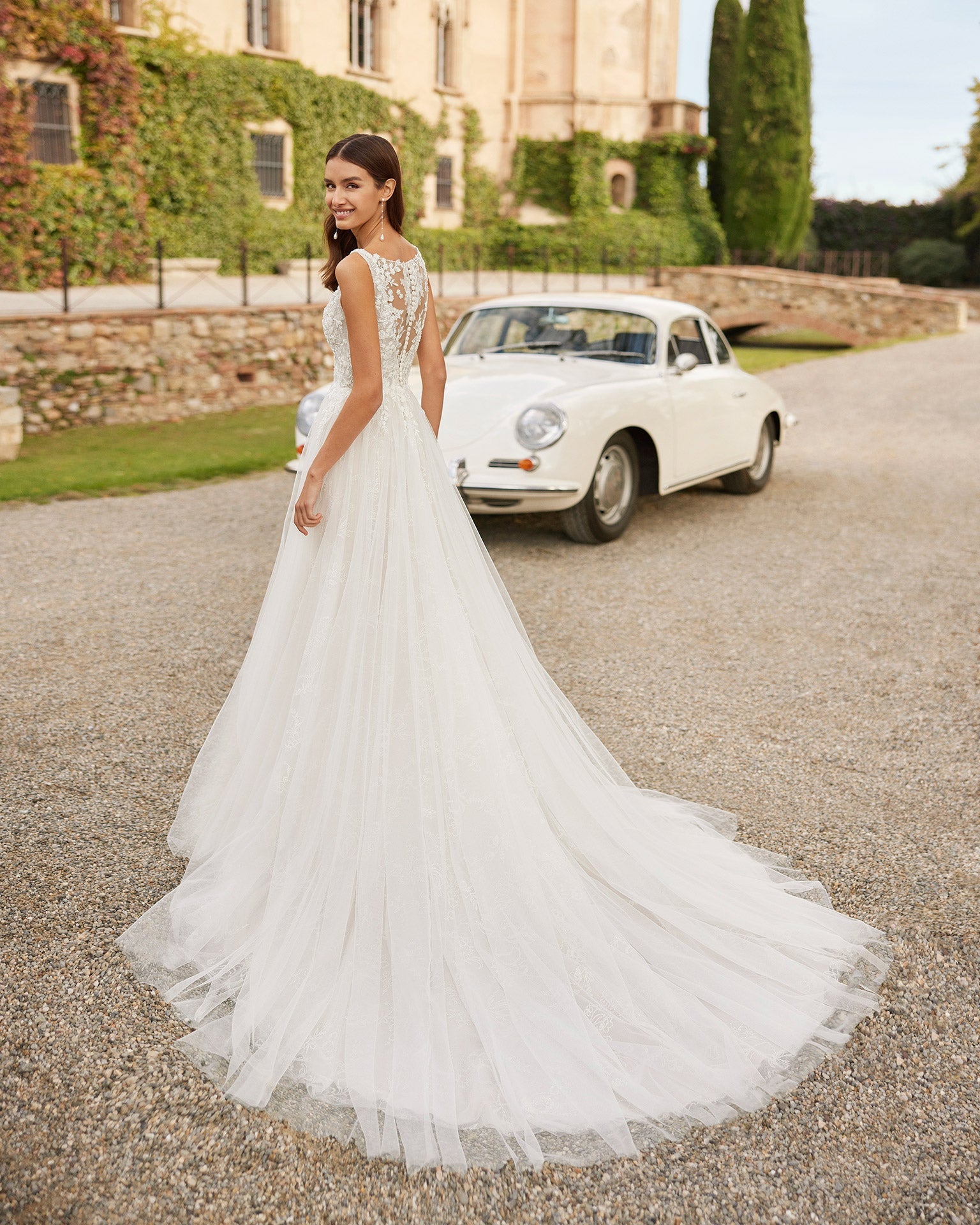 Princess-style wedding dress, with a matching full sheath-style skirt and shiny mesh; with a V-neckline and a plunging illusion back. Aire Royale look made of tulle and lace, embellished with beadwork.