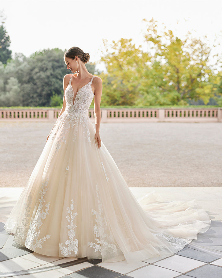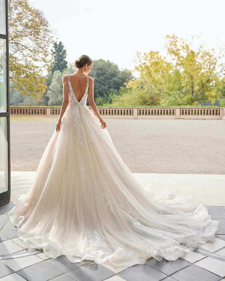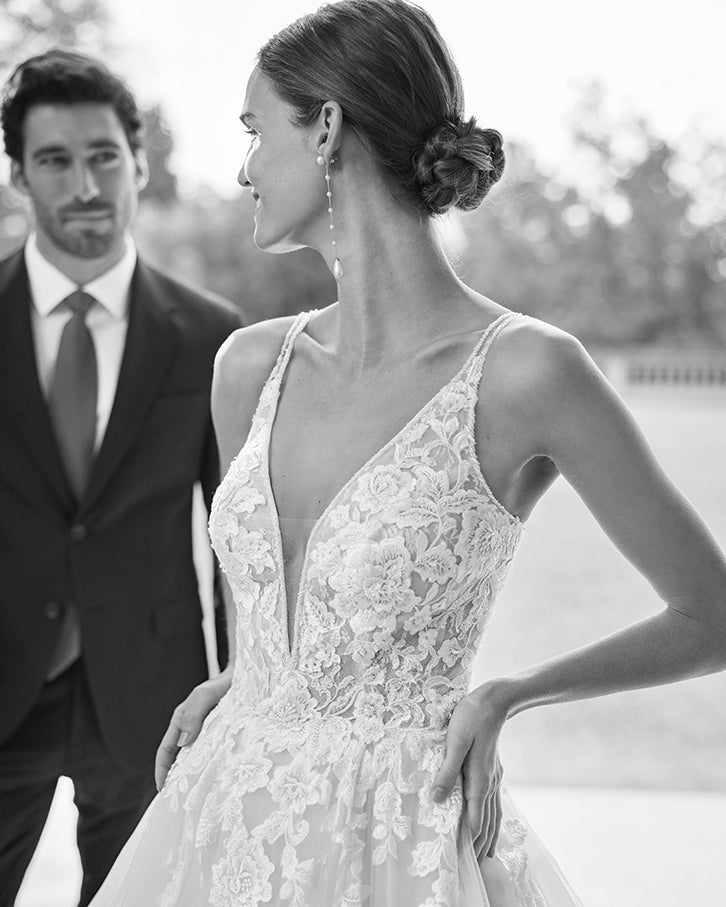 Romantic A-line wedding dress, made of tulle embellished with beadwork embroidered lace appliqués; with a deep-plunge neckline and a plunging V-back. Delicate Aire Royale design made of tulle and embroidered lace.