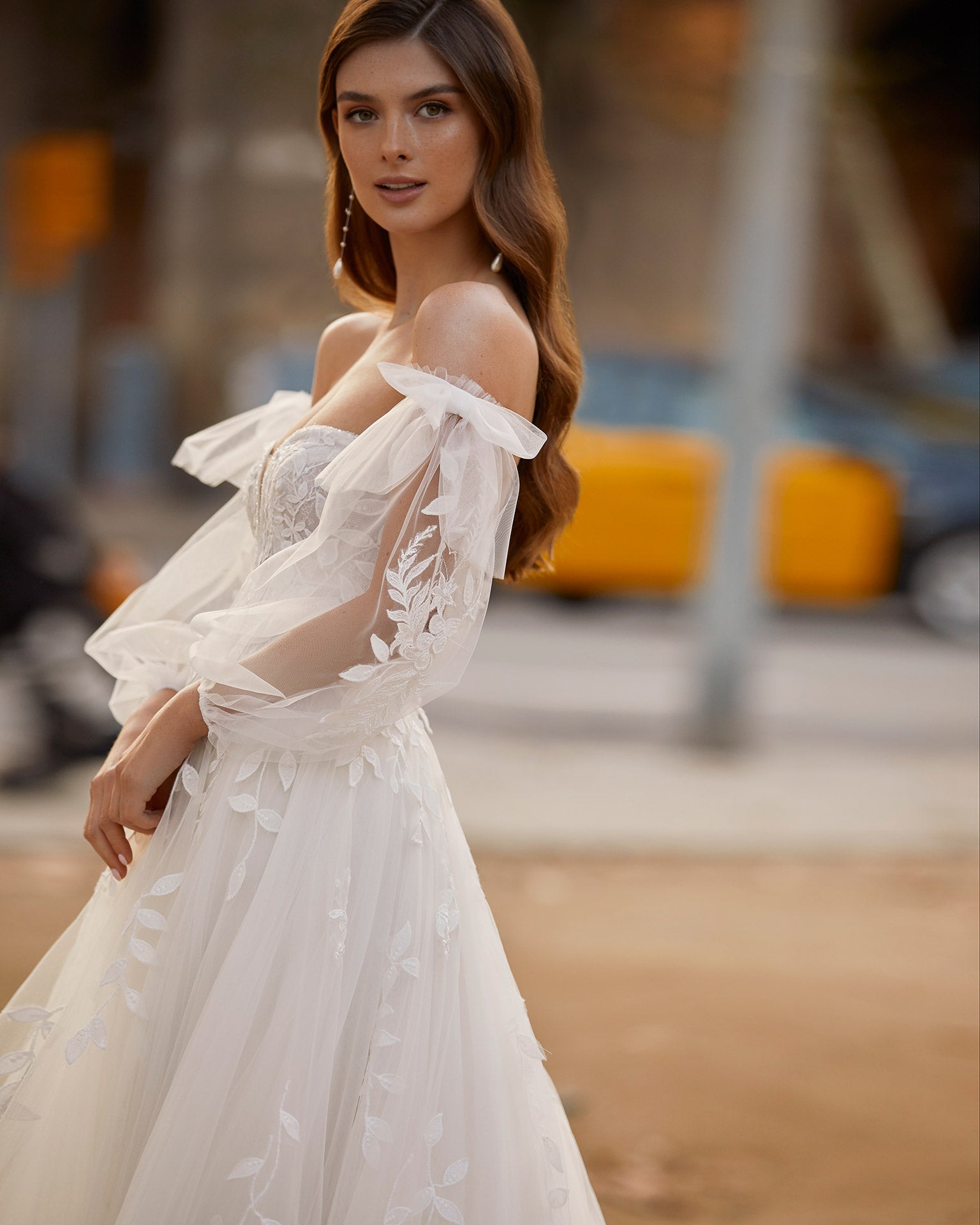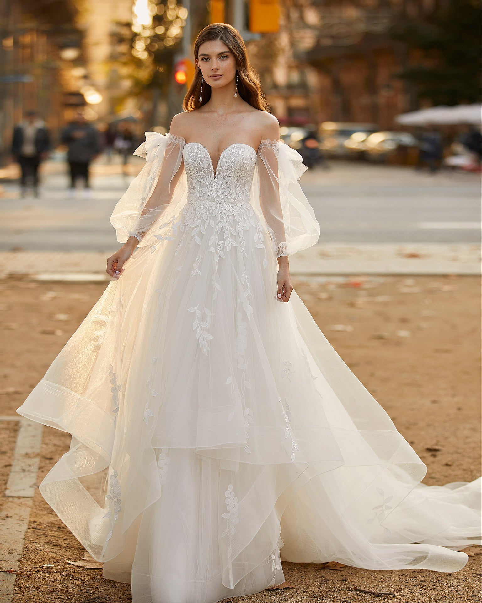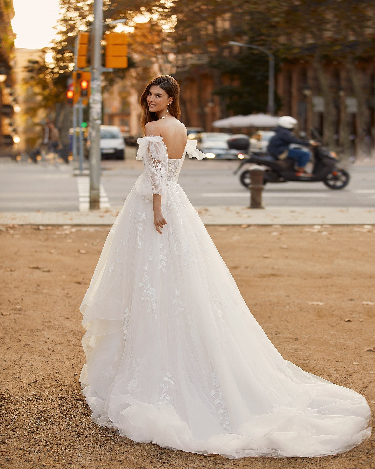Romantic princess-style wedding dress, made of tulle and lace appliqués, with a sheath-style skirt with flounces; with a deep-plunge neckline with delicate beadwork detail, an open back, and voluminous tulle sleeves. Unique Luna Novias outfit made of tulle with lace appliqués.