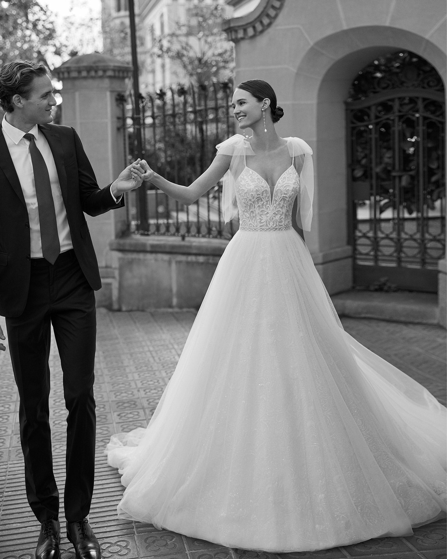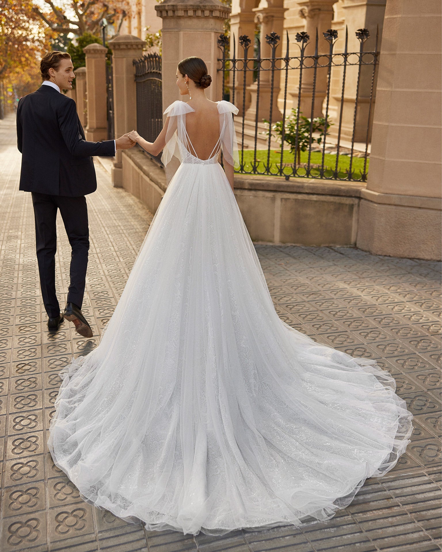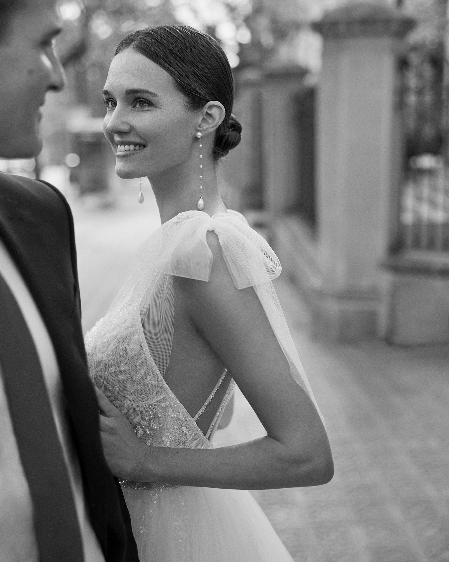 Feminine princess-style wedding dress, made of tulle with a voluminous sheath-style skirt with beadwork details. Aire Barcelona design with a deep-plunge neckline, an open back, and straps with tulle bow embellishments.