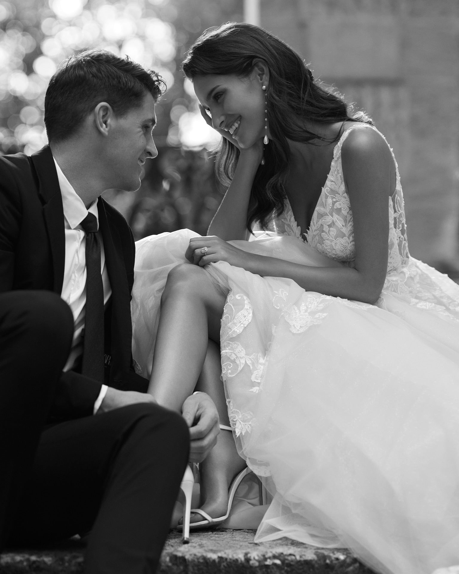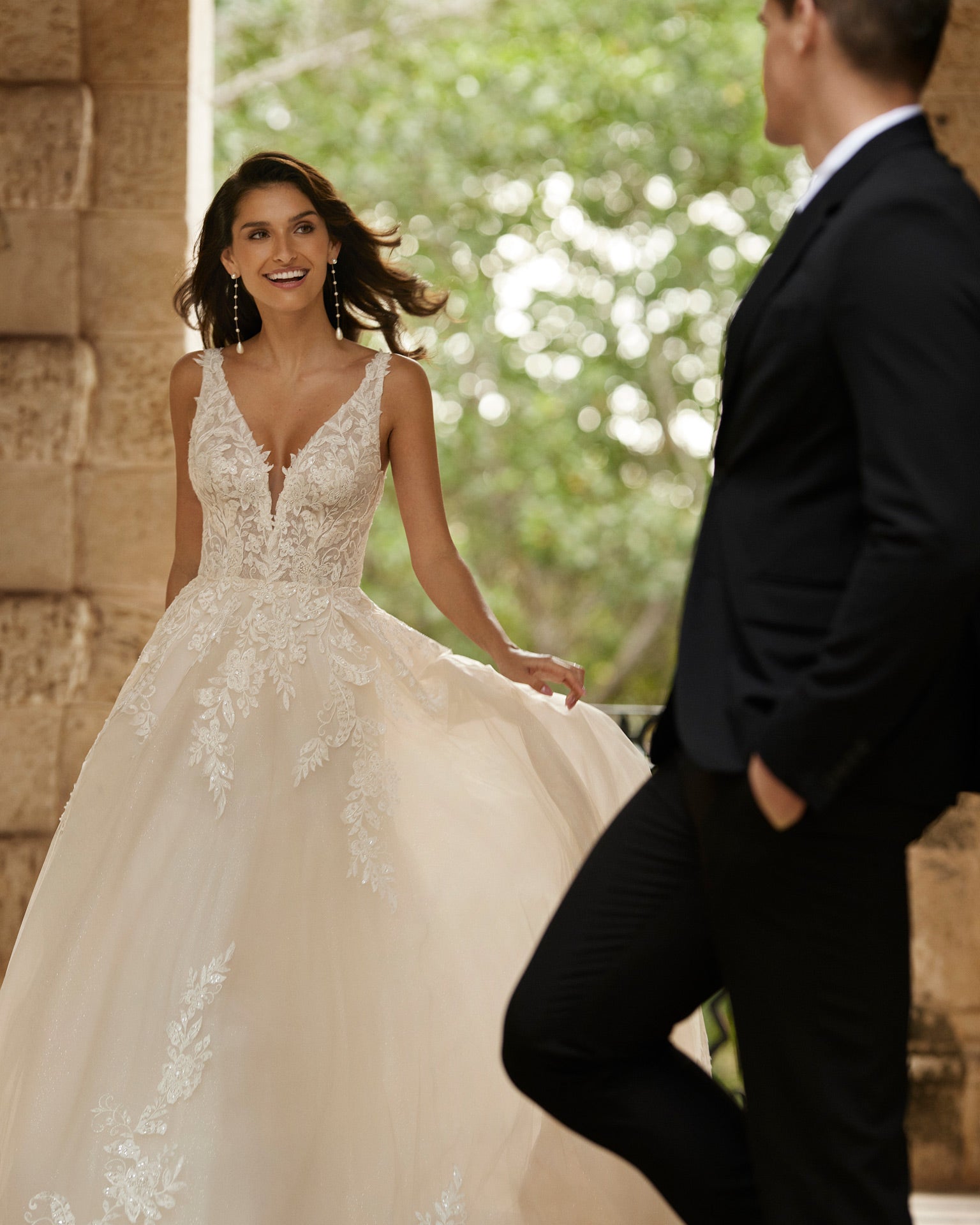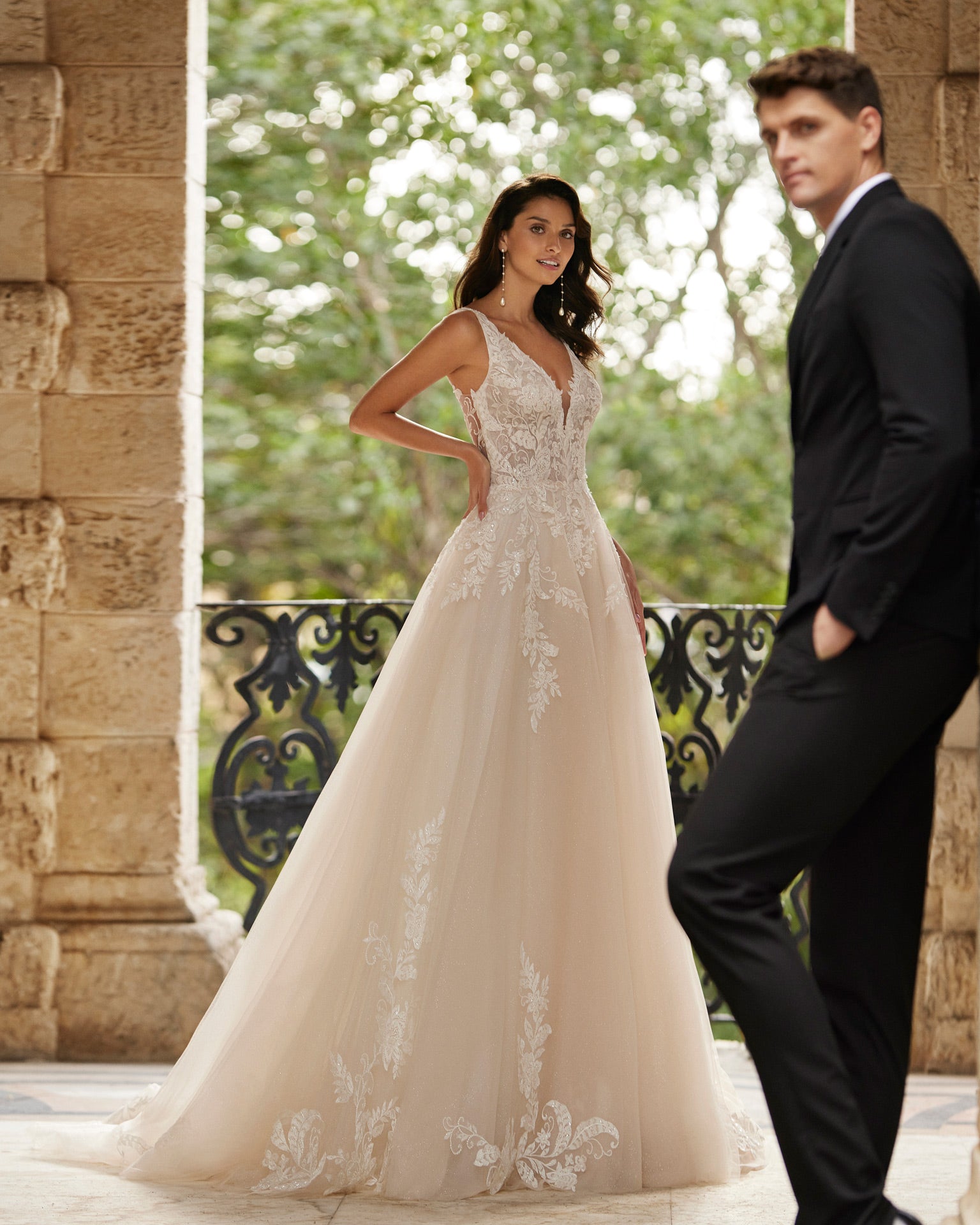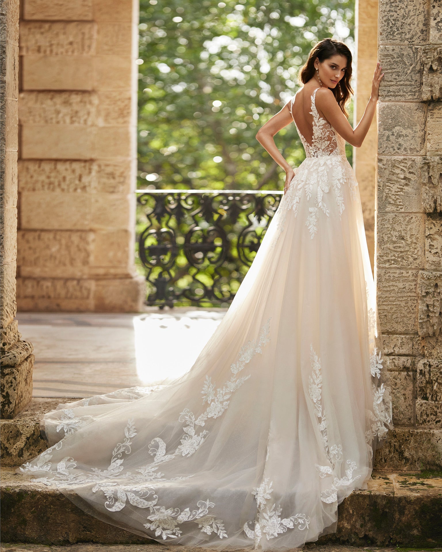 Princess-style A-line wedding dress, made in tulle combined with lace and beadwork. An exclusive Aire Royale design featuring a plunging neckline, illusion back and skirt with lace appliqués.