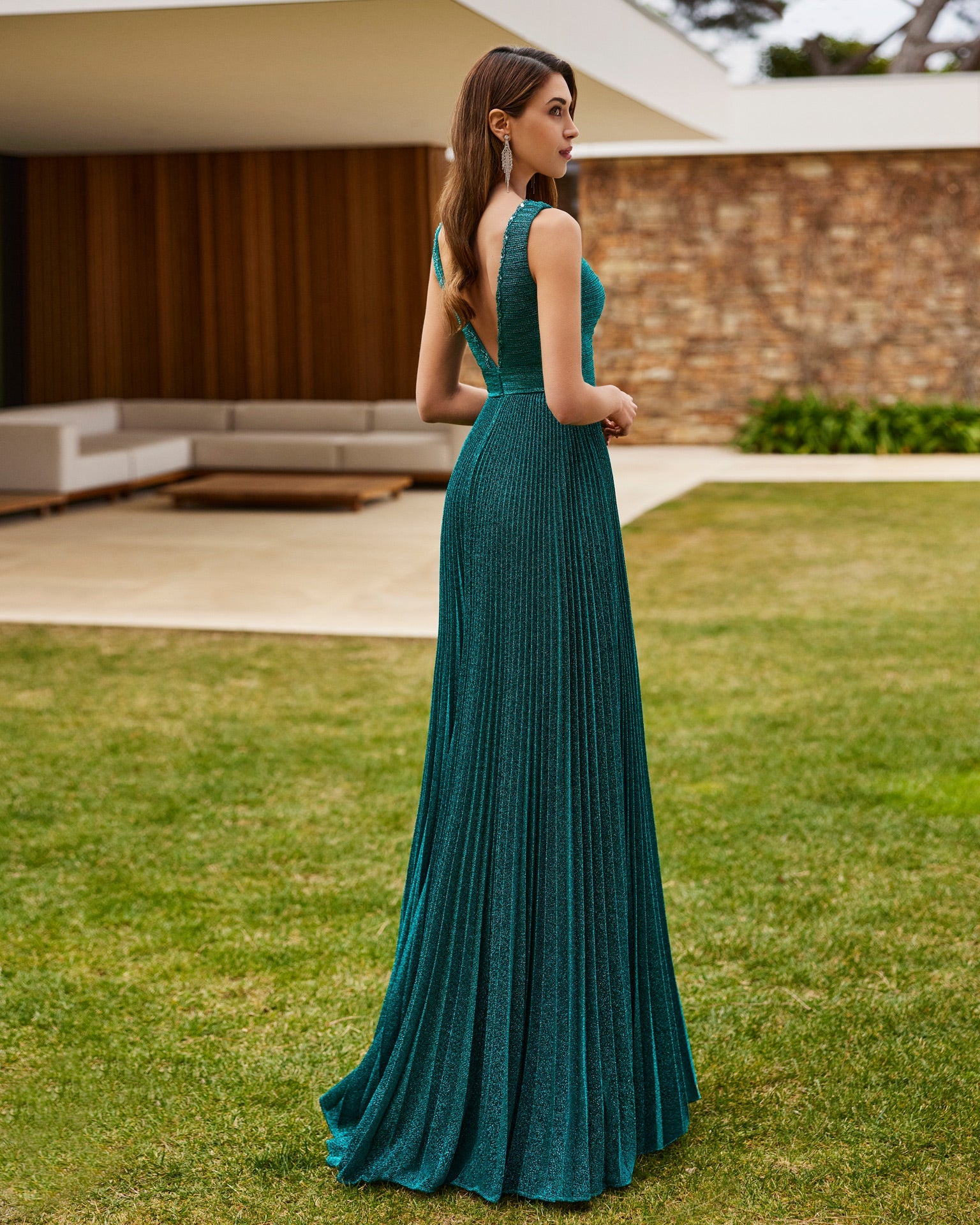 Flowing long cocktail dress. Made with lurex with beadwork details. With V-neckline and V-back. Marfil Barcelona design for parties and events.