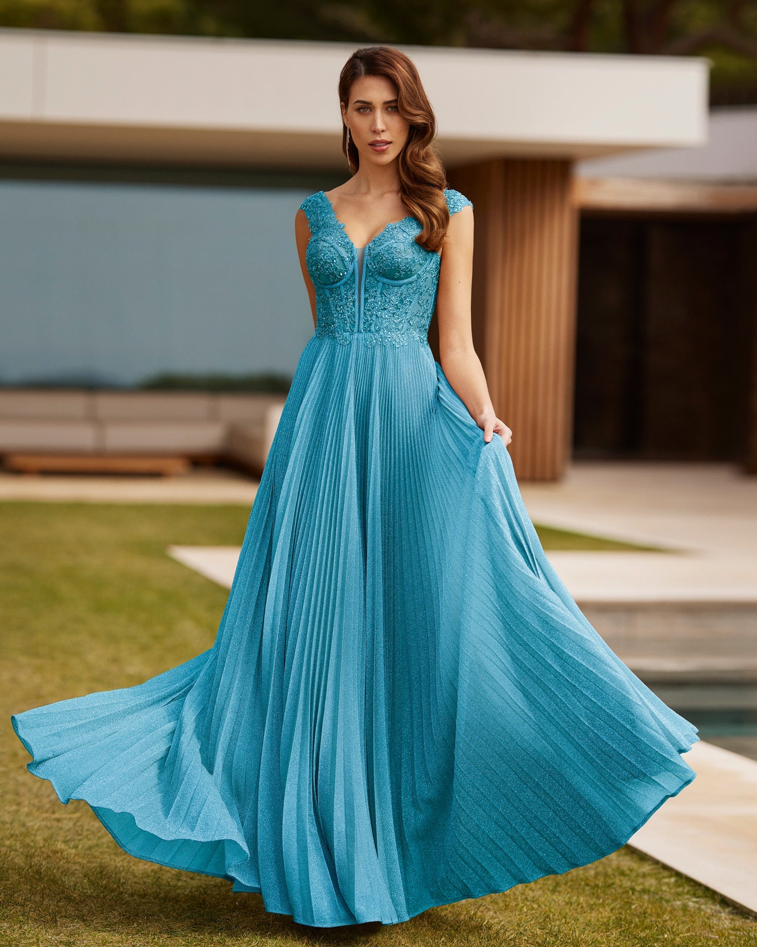 Flowing long evening dress. Crafted with lurex, beadwork lace. With V-neckline, open back and draped straps. Exclusive Marfil Barcelona look.