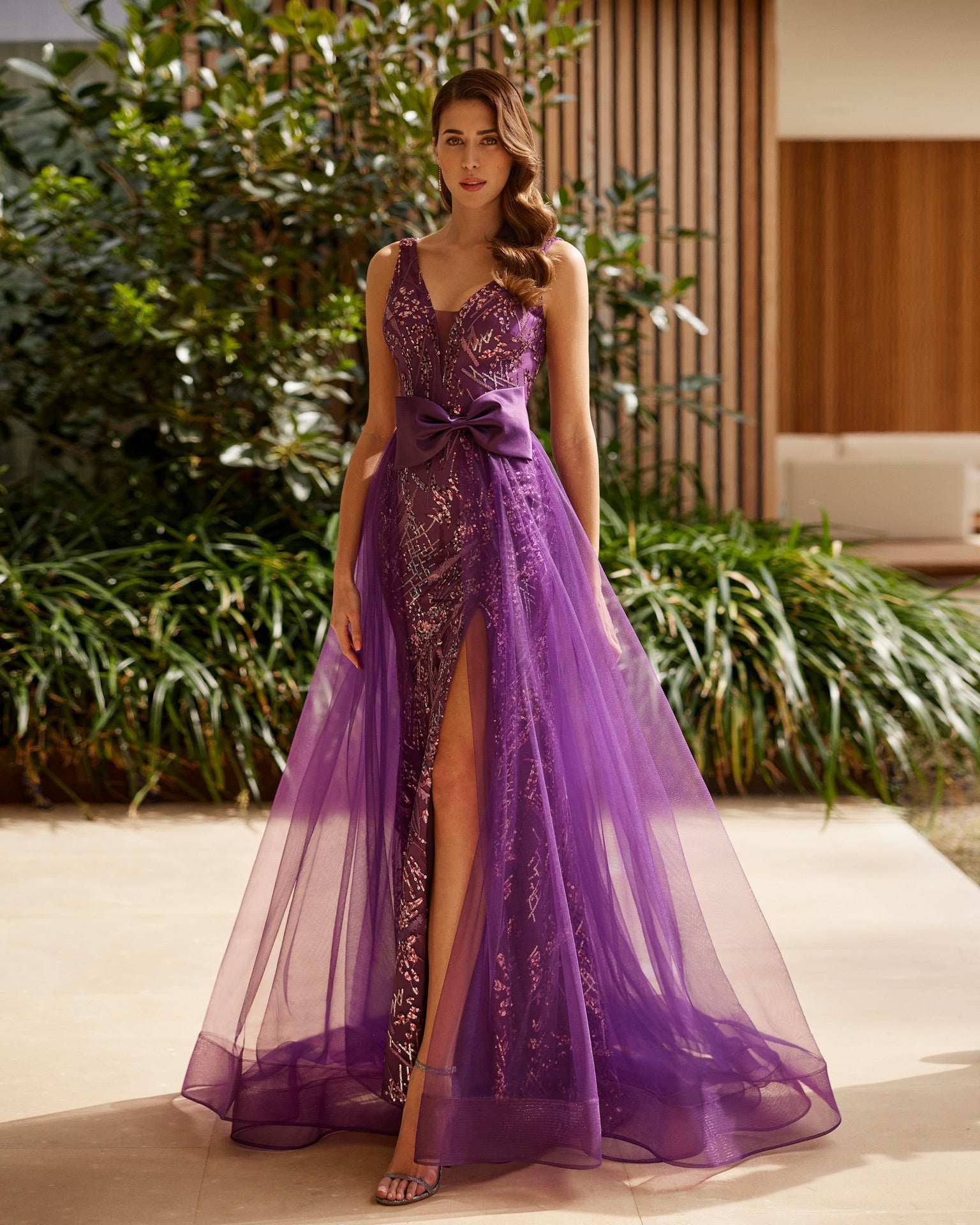 Fairytale style long gala dress. Crafted with tulle and beadwork lace. With V-neckline, V back, and straps. With tulle overskirt. Exclusive Marfil Barcelona look.