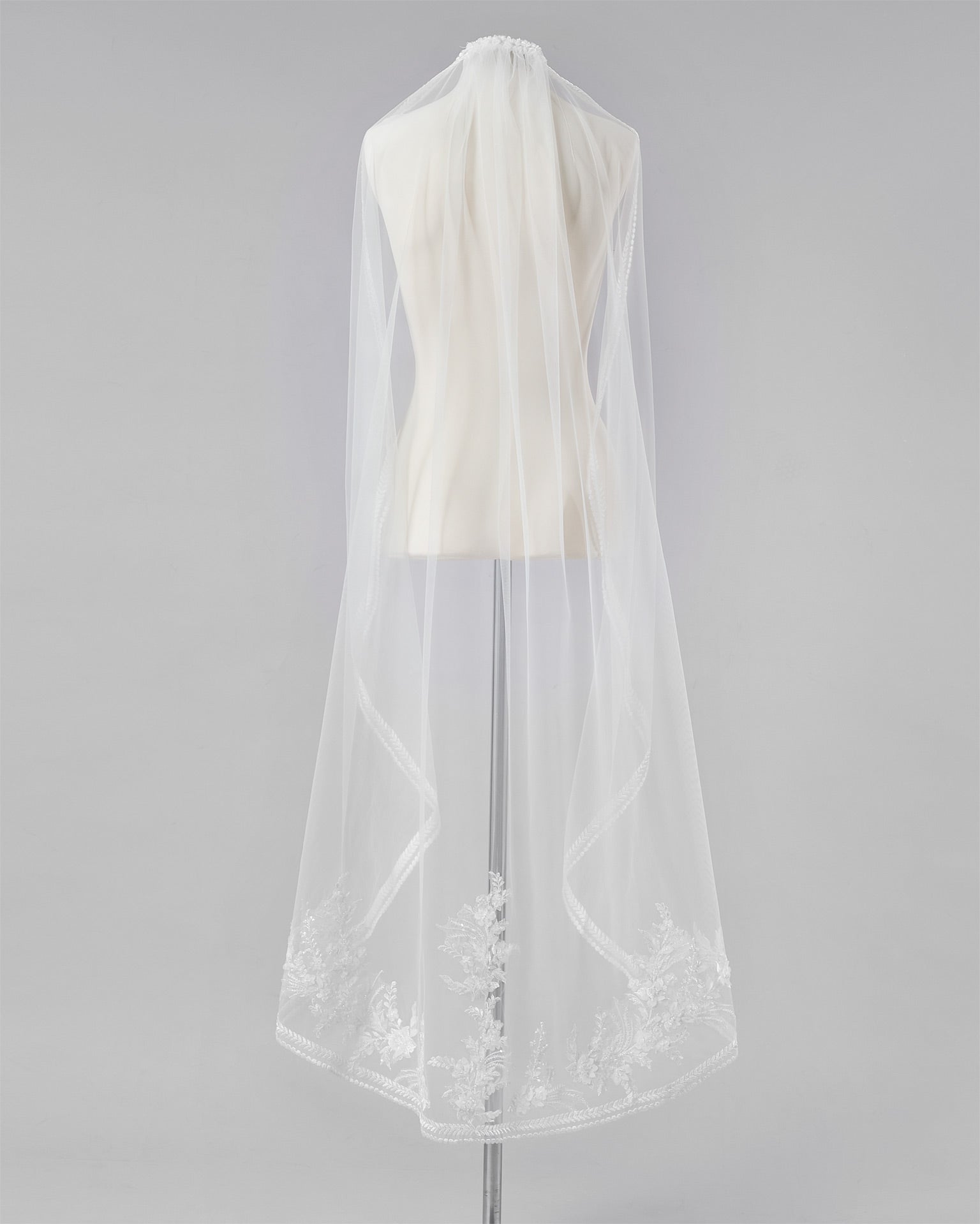 Tulle, lace, and beadwork bridal veil with comb and pearls.