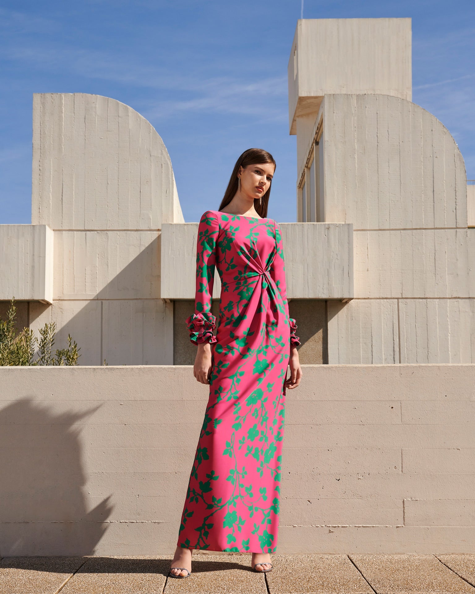 Simple long flowing guest dress. Made of print satin. Bateau neckline, plunging back and flounced long sleeve. Skirt with back slit. Aire Barcelona design for parties and celebrations.
