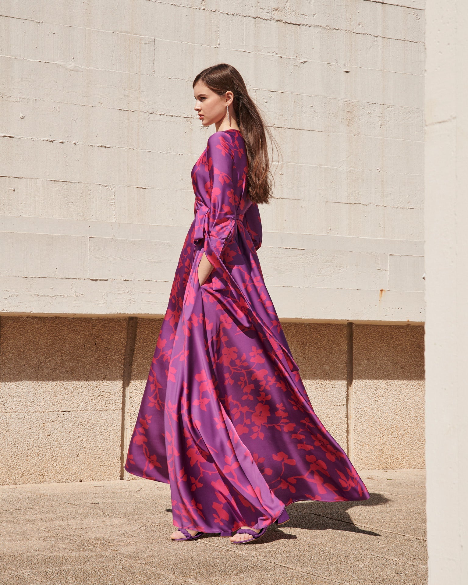 Modern long guest dress. Made of print satin. With V-neckline, closed back and long sleeves. Aire Barcelona look for parties and celebrations.