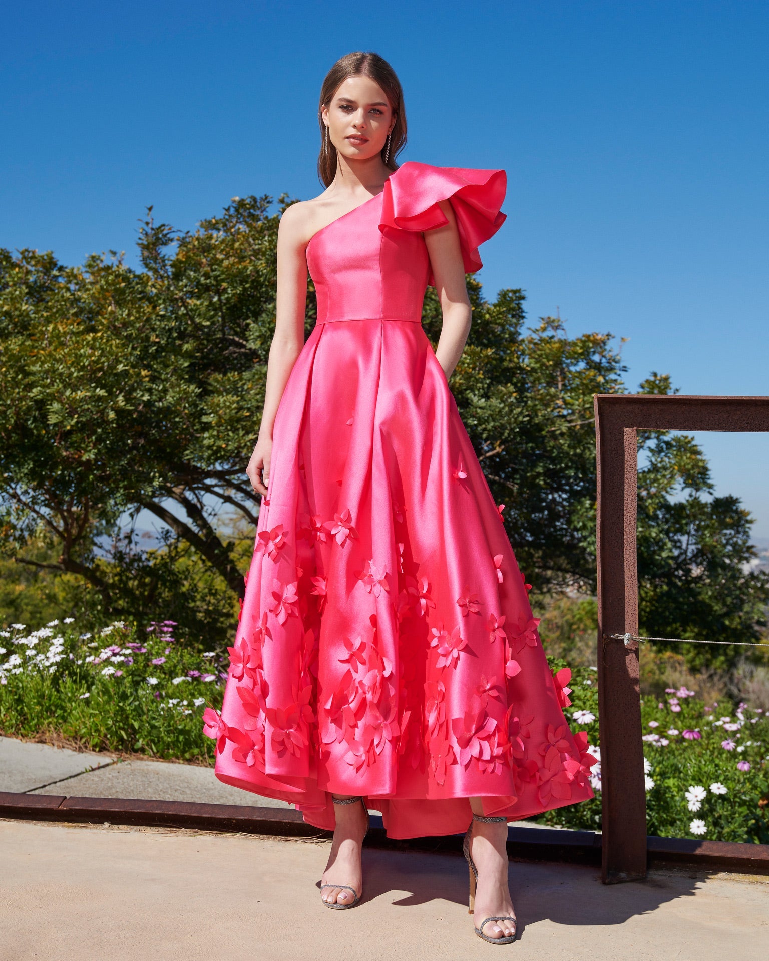 Classic style high low evening dress. Made in mikado coupled with cloth flowers. With asymmetric neckline, closed back, strap and pockets. Delicate Aire Barcelona look.