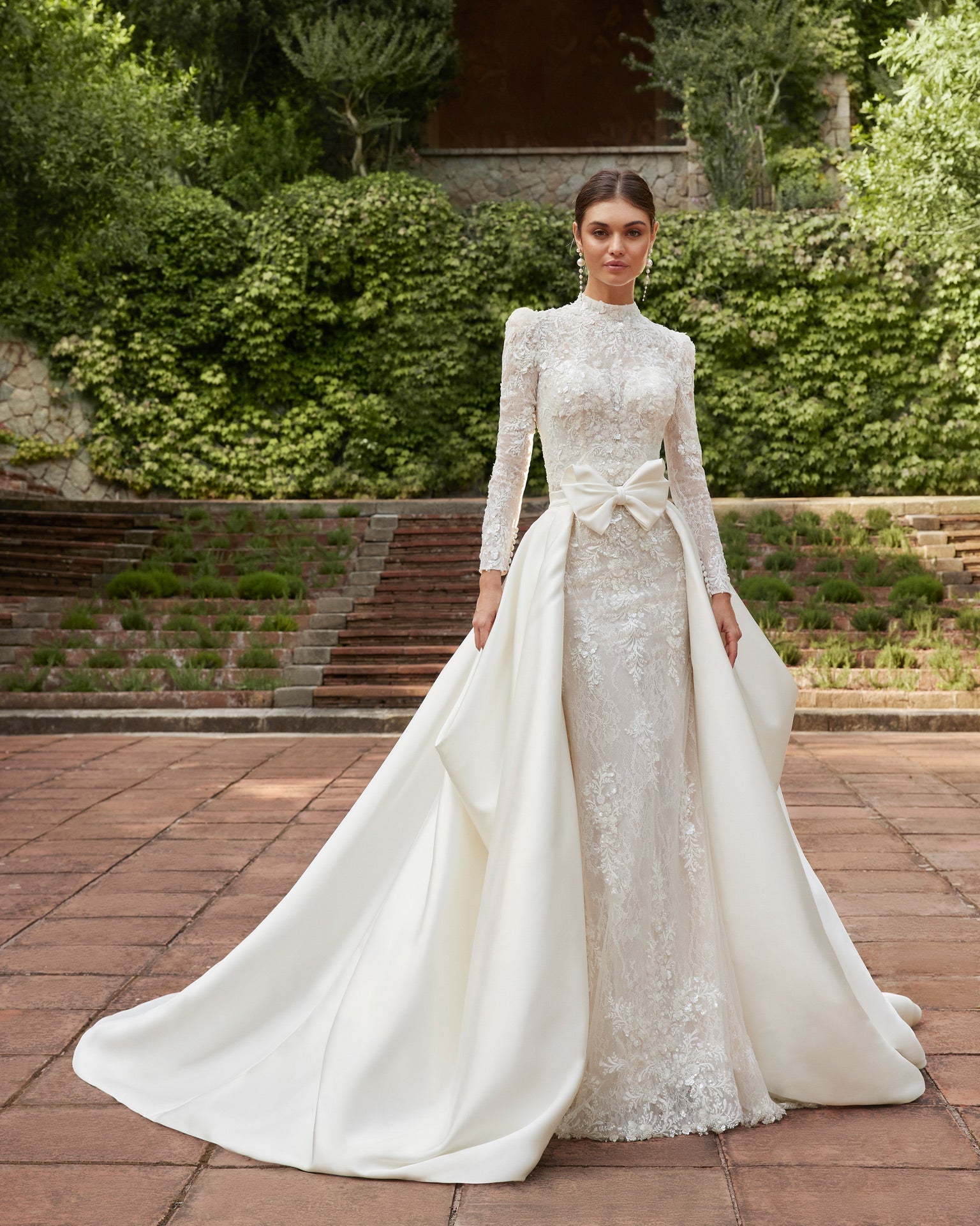 Super sexy two-piece mermaid wedding dress, made in lace and beadwork. Featuring a high neck, closed back, long skirt and detachable mikado overskirt, this dreamy Luna Studio design will make you shine.