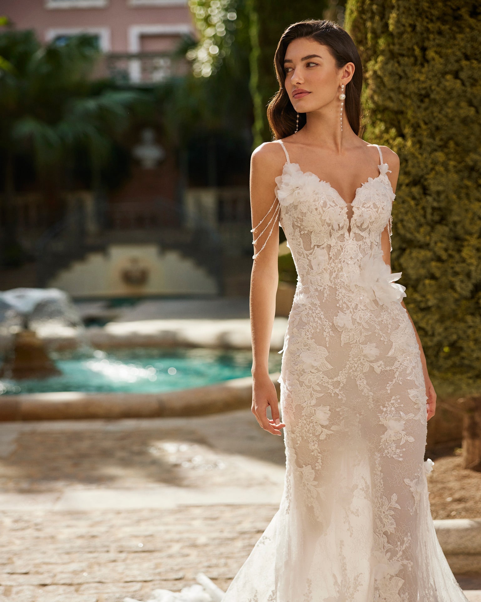 Long sexy mermaid wedding dress, made with lace. Featuring a sweetheart neckline, plunging back and straps with flower embellishment.