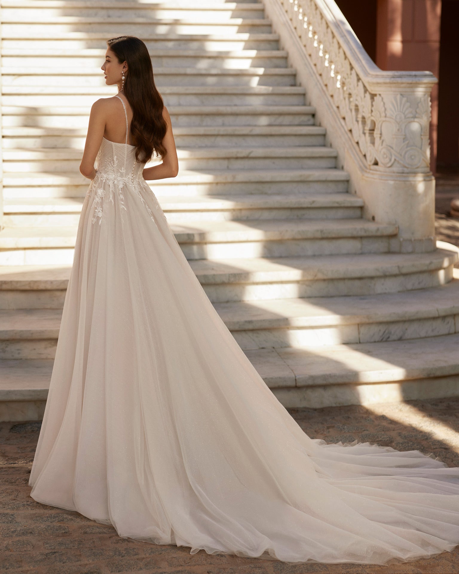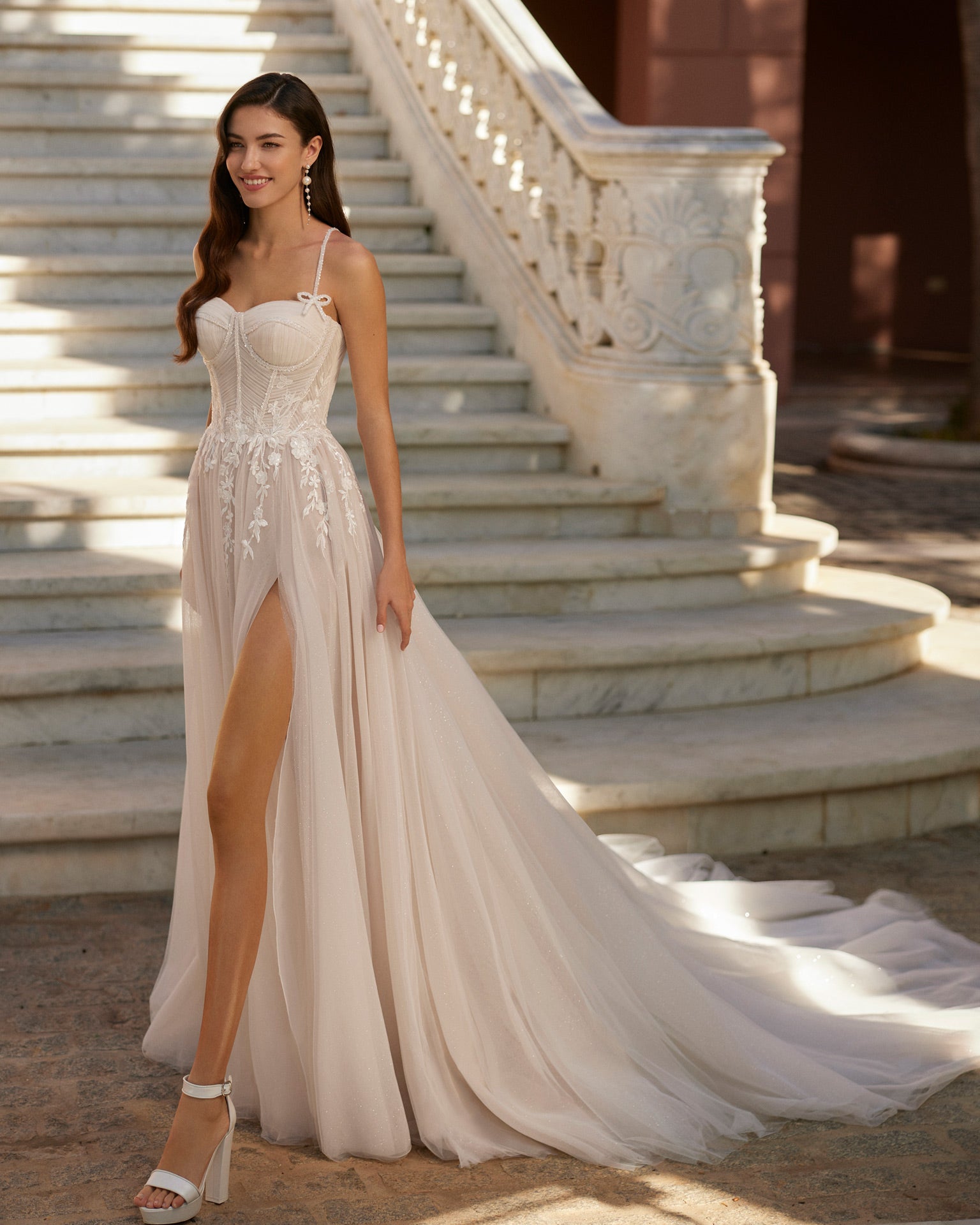 Sexy long A-line wedding dress, crafted in lace with a tulle skirt. Featuring a sweetheart neckline, buttoned back, tie straps and skirt with a front slit.