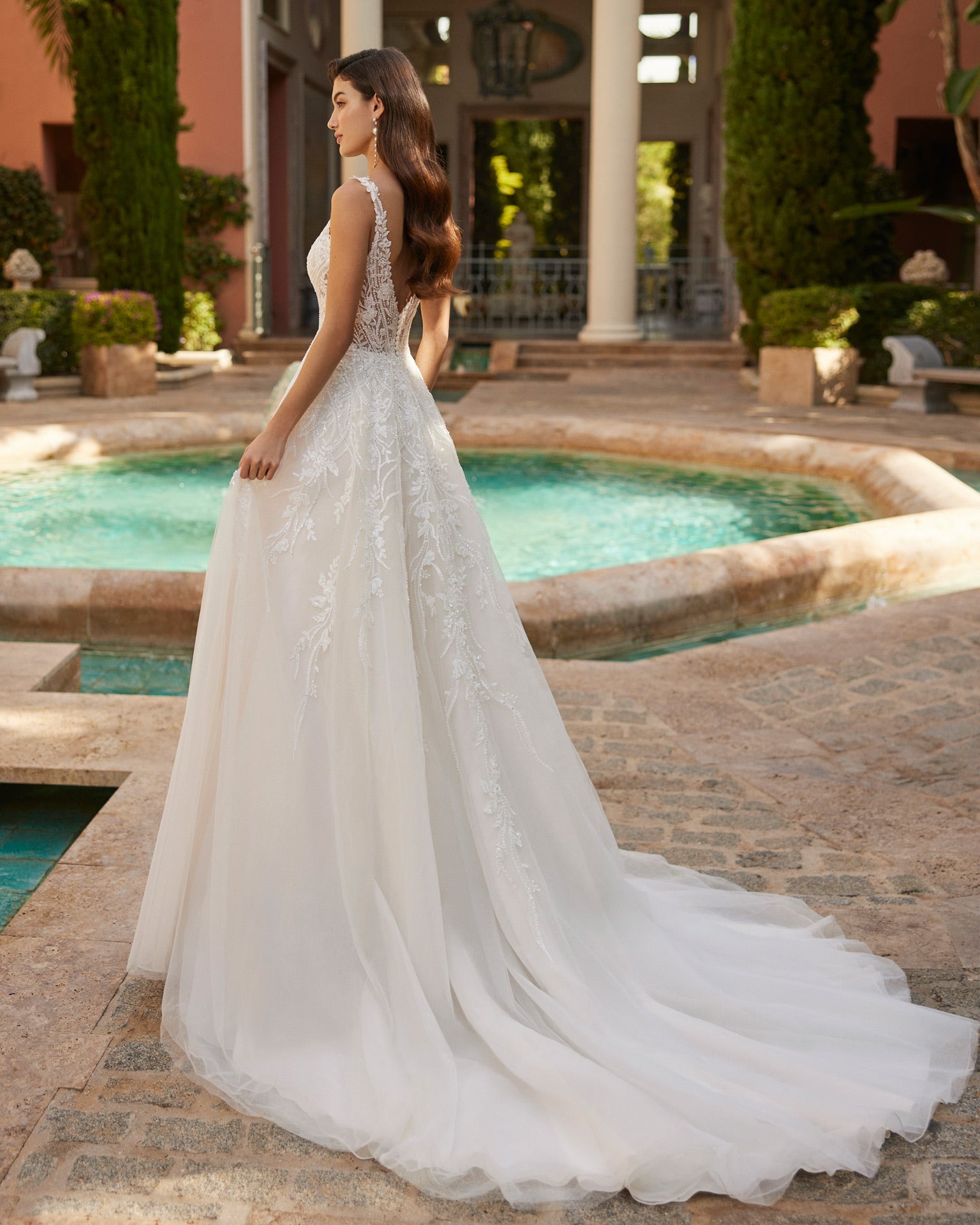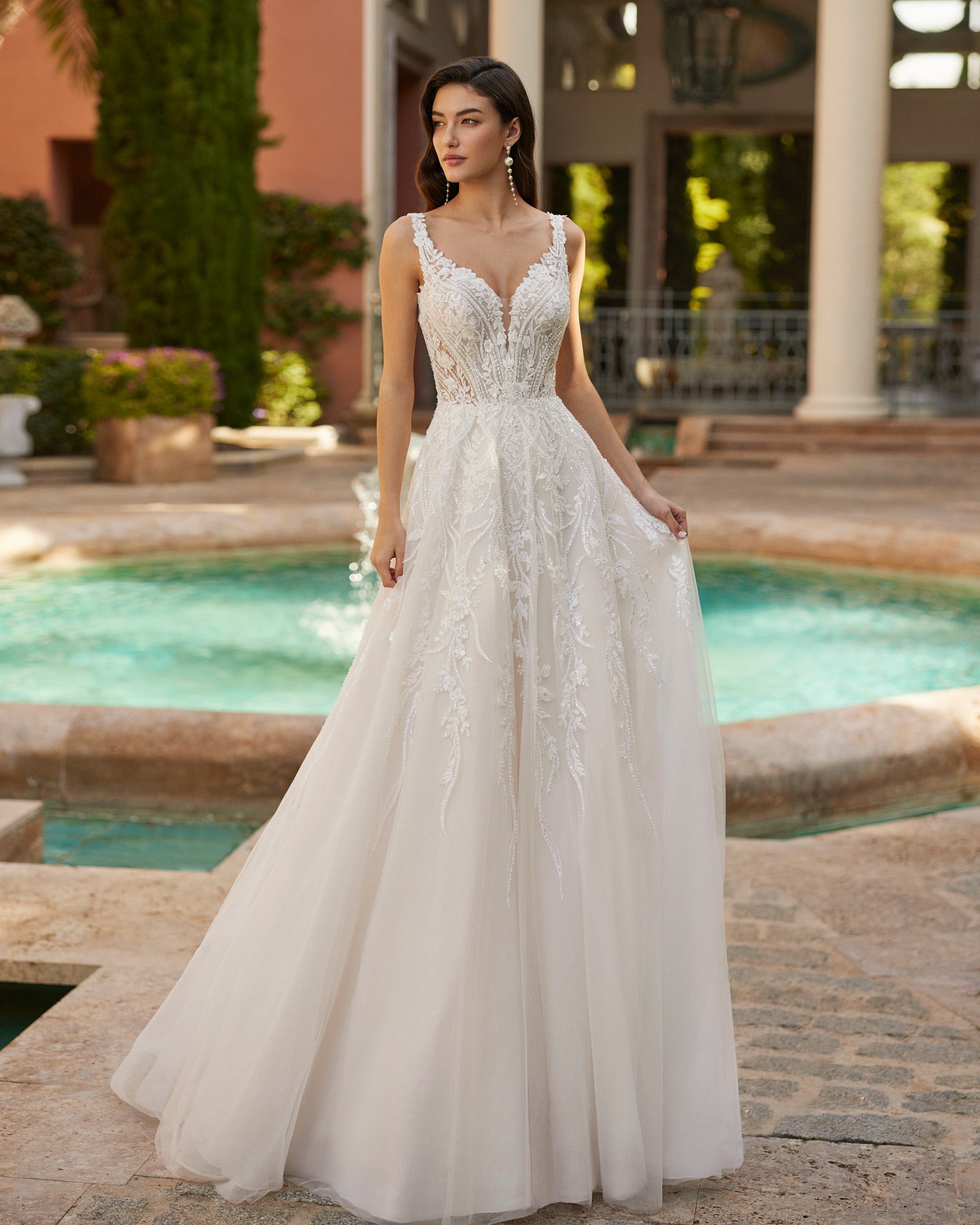Long A-line princess wedding dress, crafted in lace combined with tulle. Showcasing a plunging neckline, buttoned back and straps with detachable sleeves.
