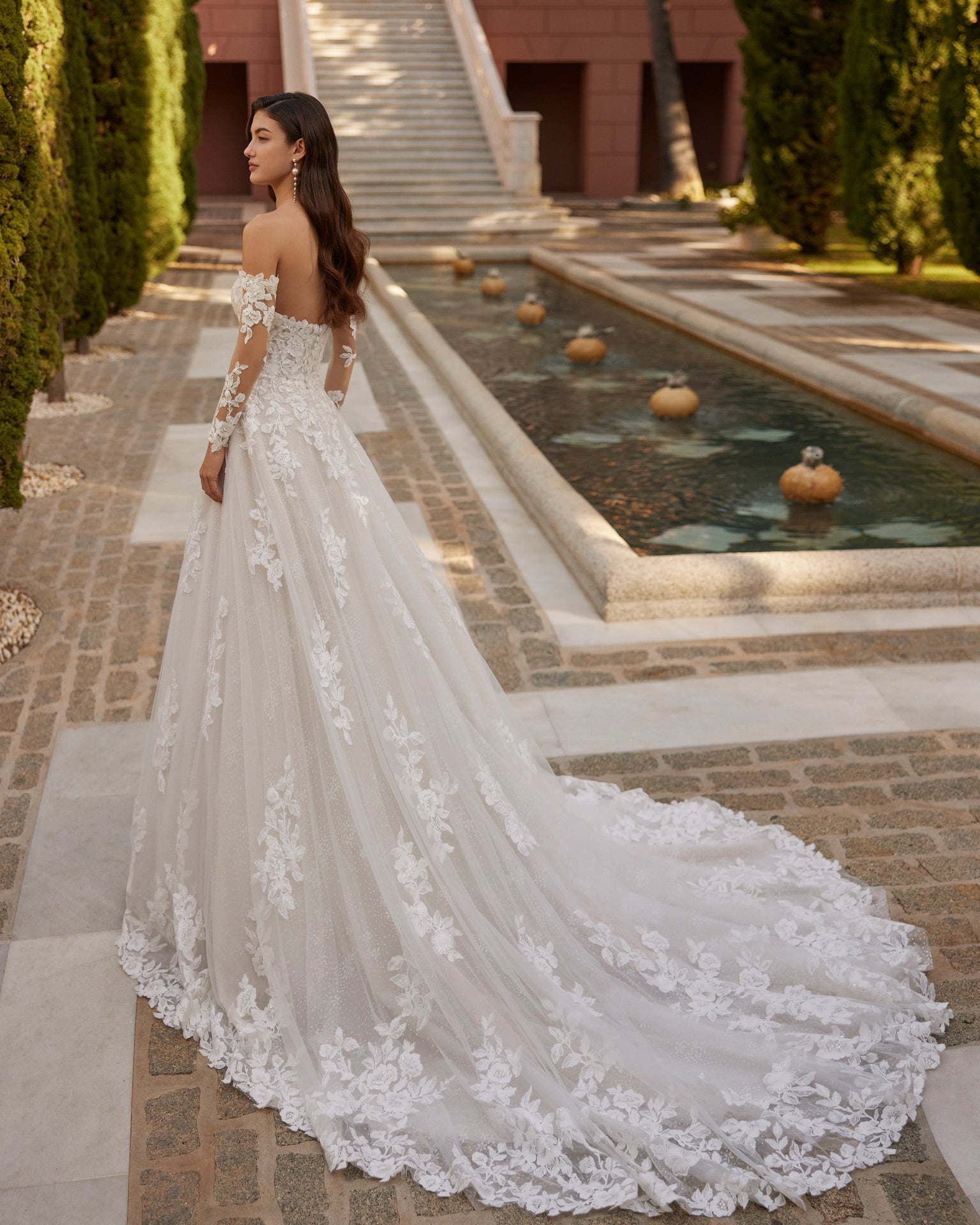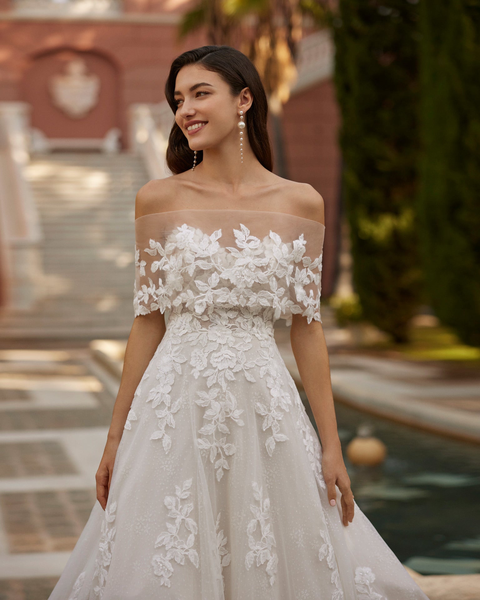 Long romantic princess wedding dress, crafted in lace with a snow tulle skirt. Featuring a sweetheart neckline, buttoned back, detachable sleeves and detachable off-shoulder cuff neckline.