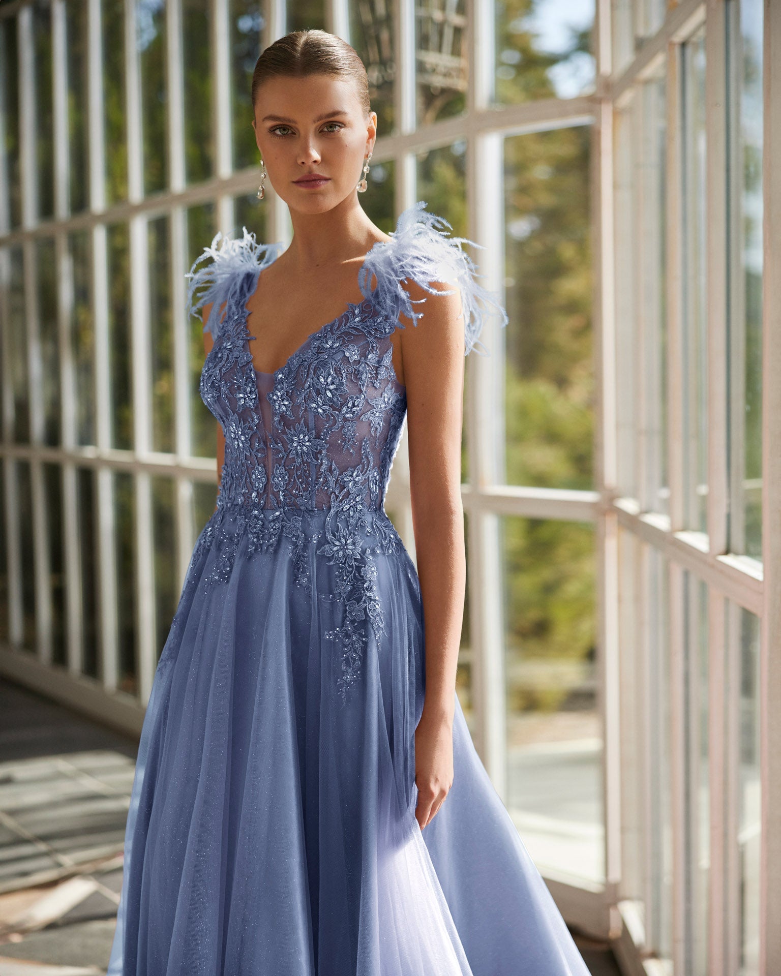 Long evening dress crafted in tulle with lace and beadwork. Featuring a V-neckline and V-back, and straps. A Marfil Barcelona look.
