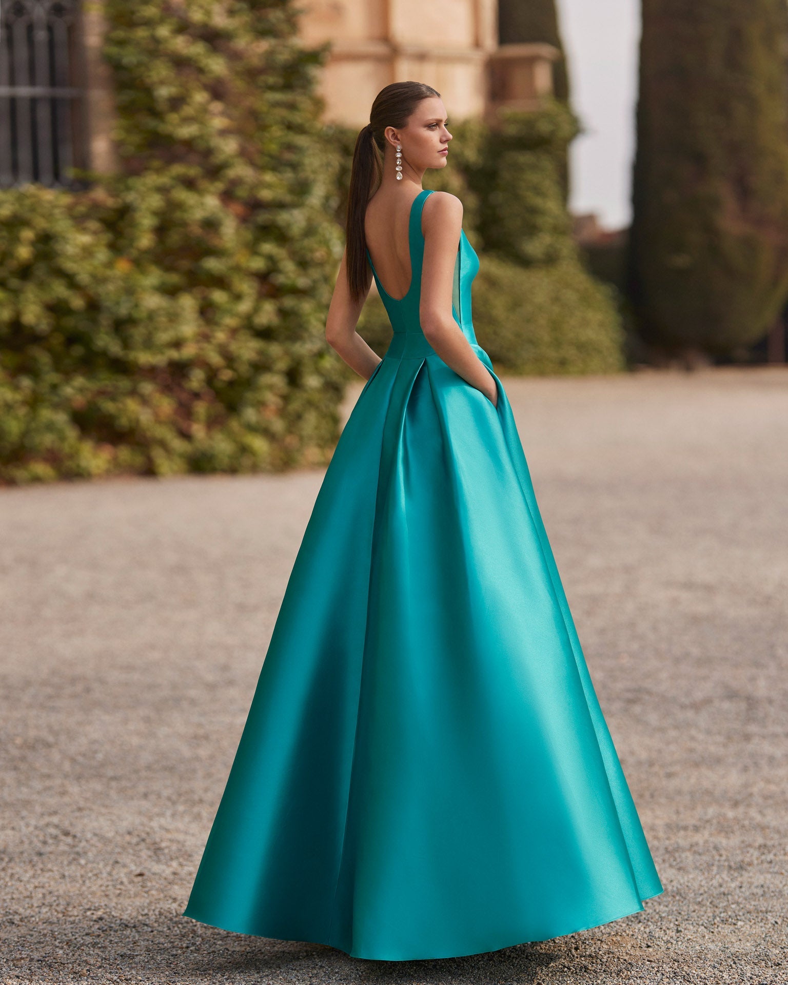 Long evening dress crafted in mikado. Featuring a V-neckline, open back, straps and a skirt with pockets. A Marfil Barcelona look.