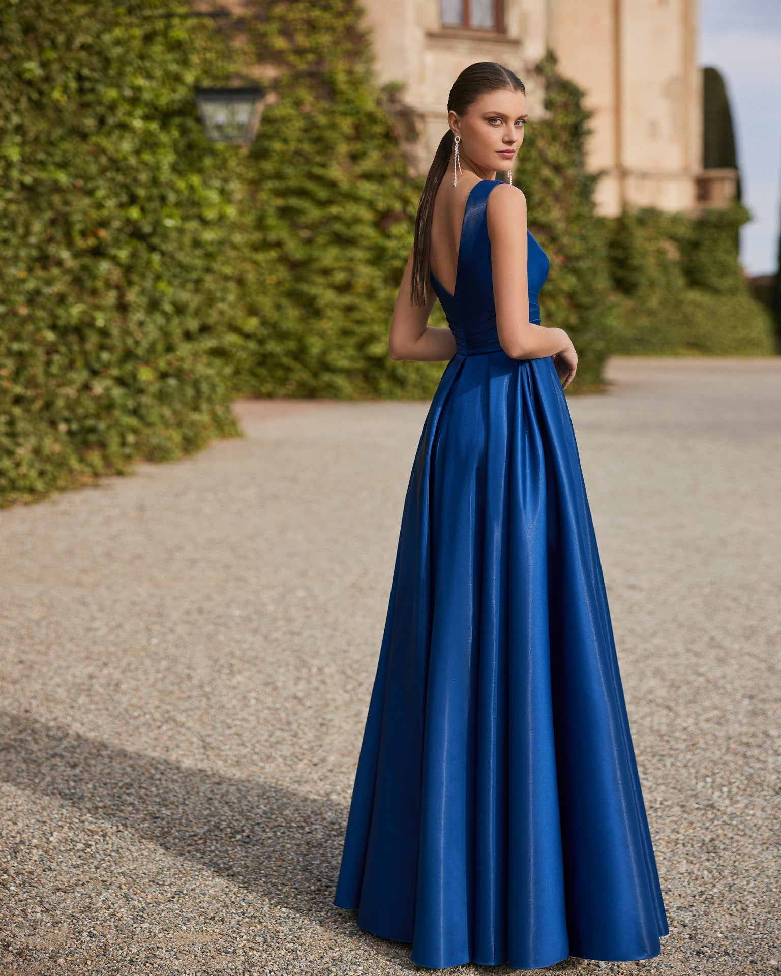 Long evening dress made in satin. Showcase a V-neckline and V-back, straps, a decorative bow at the waist and pockets. A Marfil Barcelona look.