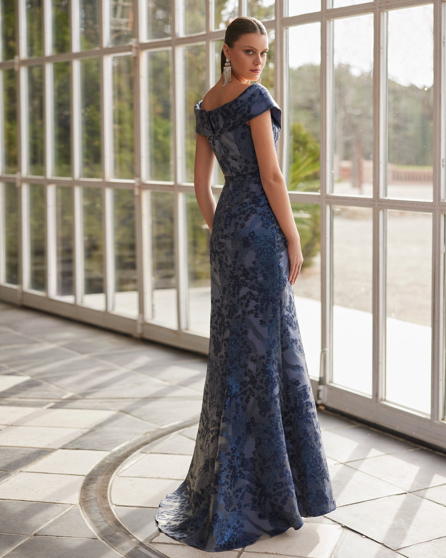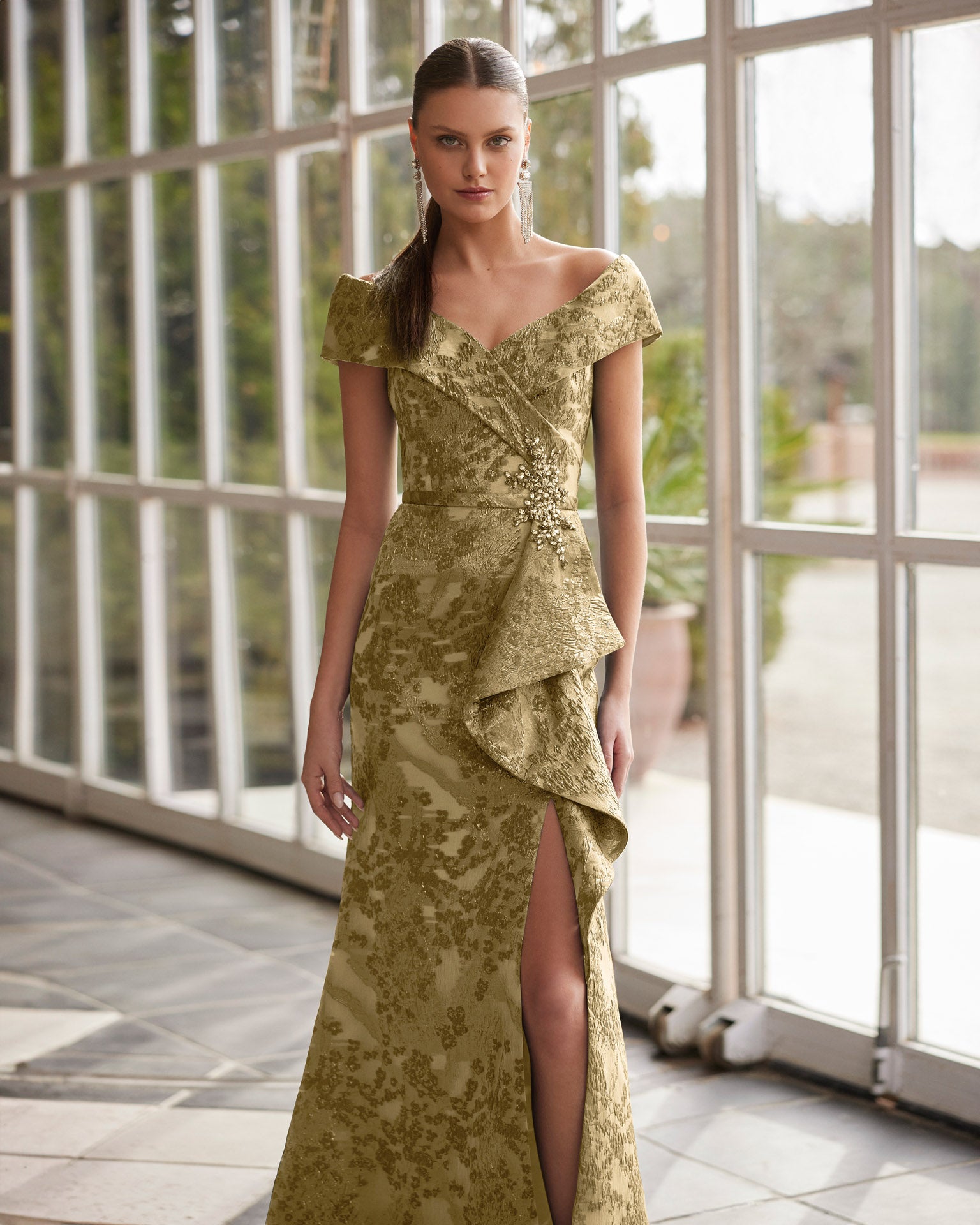 Long evening dress crafted in fil coupé combined with beadwork. Featuring an off-shoulder neckline, keyhole back and beadwork embellishments. A Marfil Barcelona look.