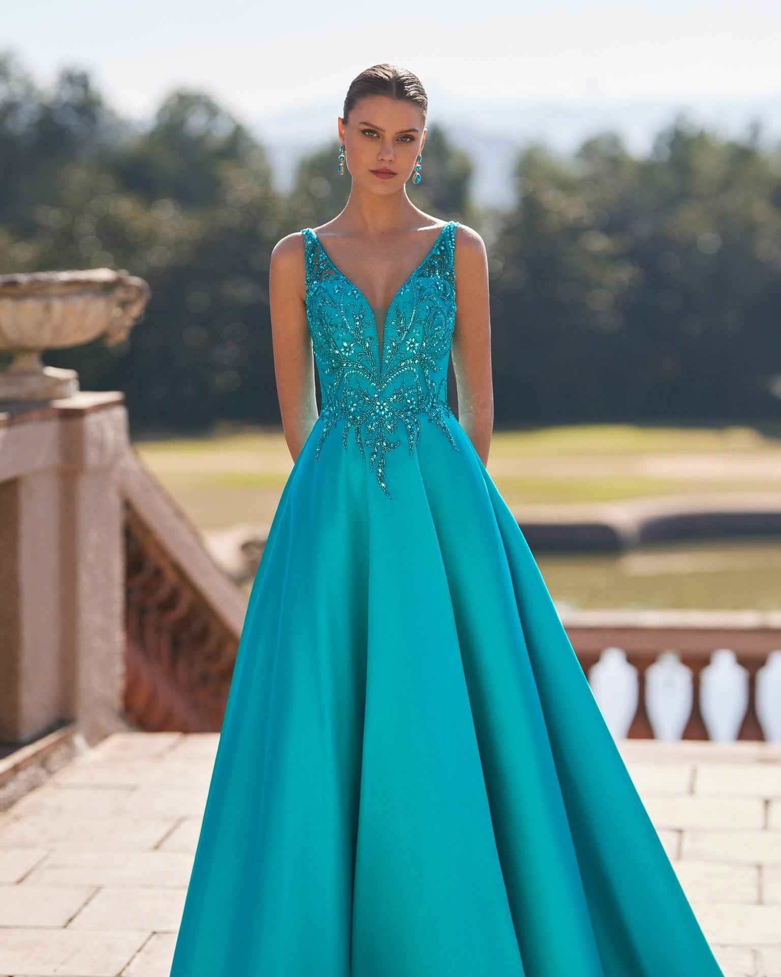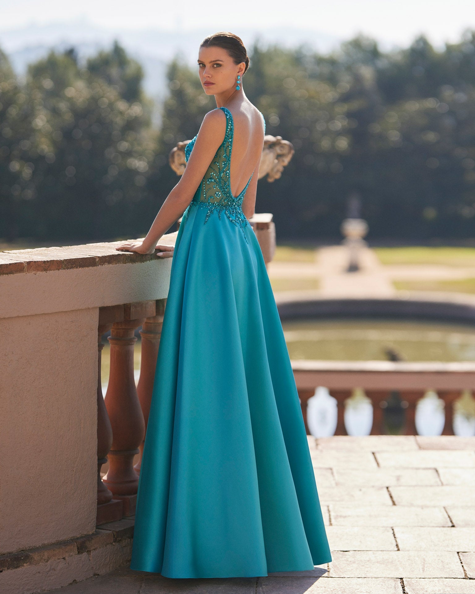 Two-piece long evening dress crafted in mikado combined with beadwork. Featuring a sweetheart neckline, open back and lace sleeve. A Marfil Barcelona look.