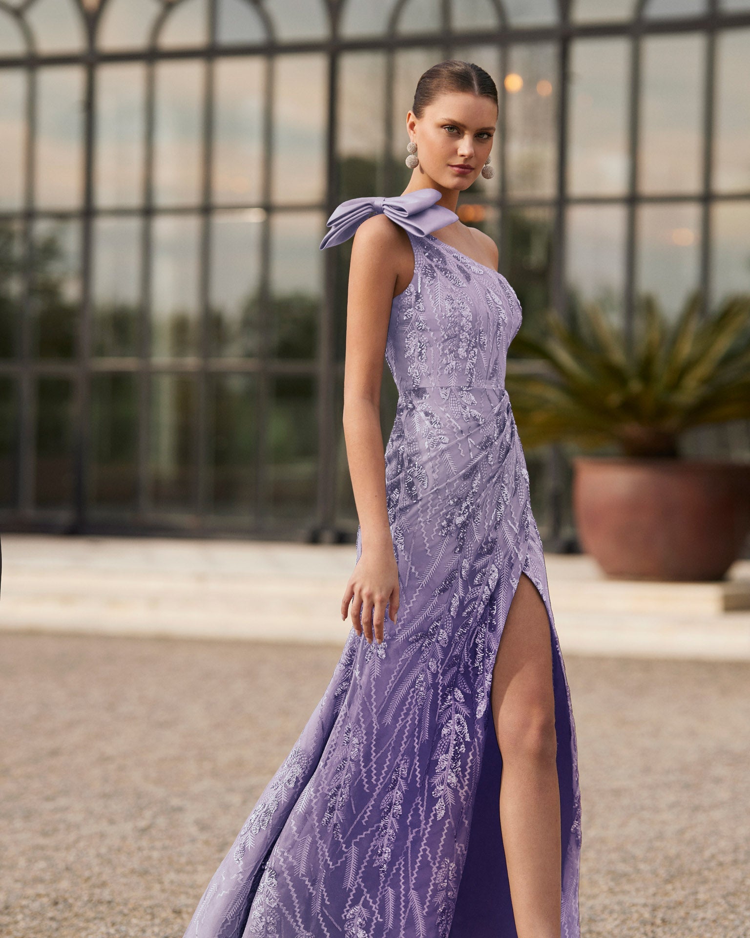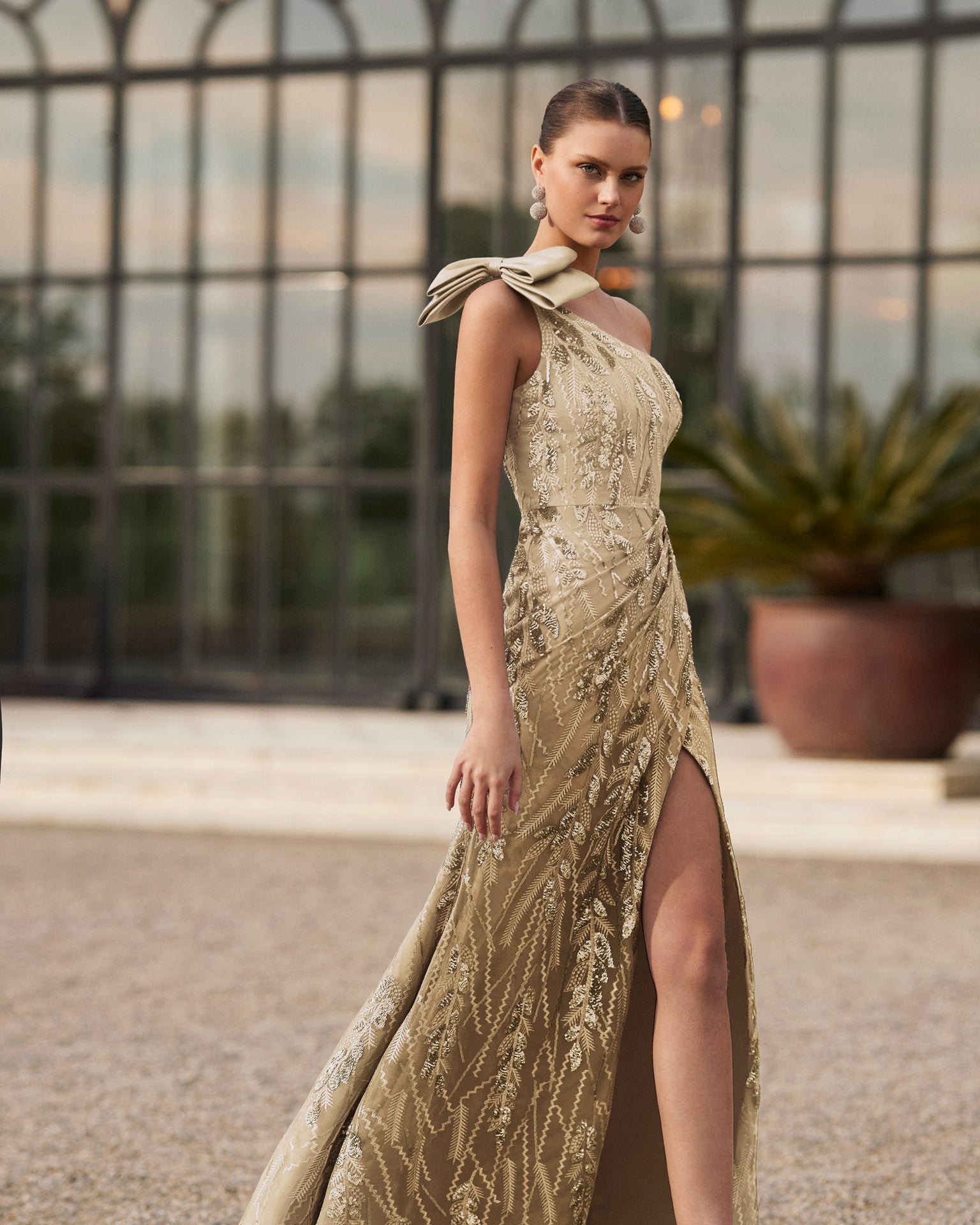 Two-piece long evening dress, crafted in lace, beadwork and mikado. Showcase an asymmetric neckline, sleeveless bodice, skirt with a side slit, and asymmetric bow. A Marfil Barcelona look.