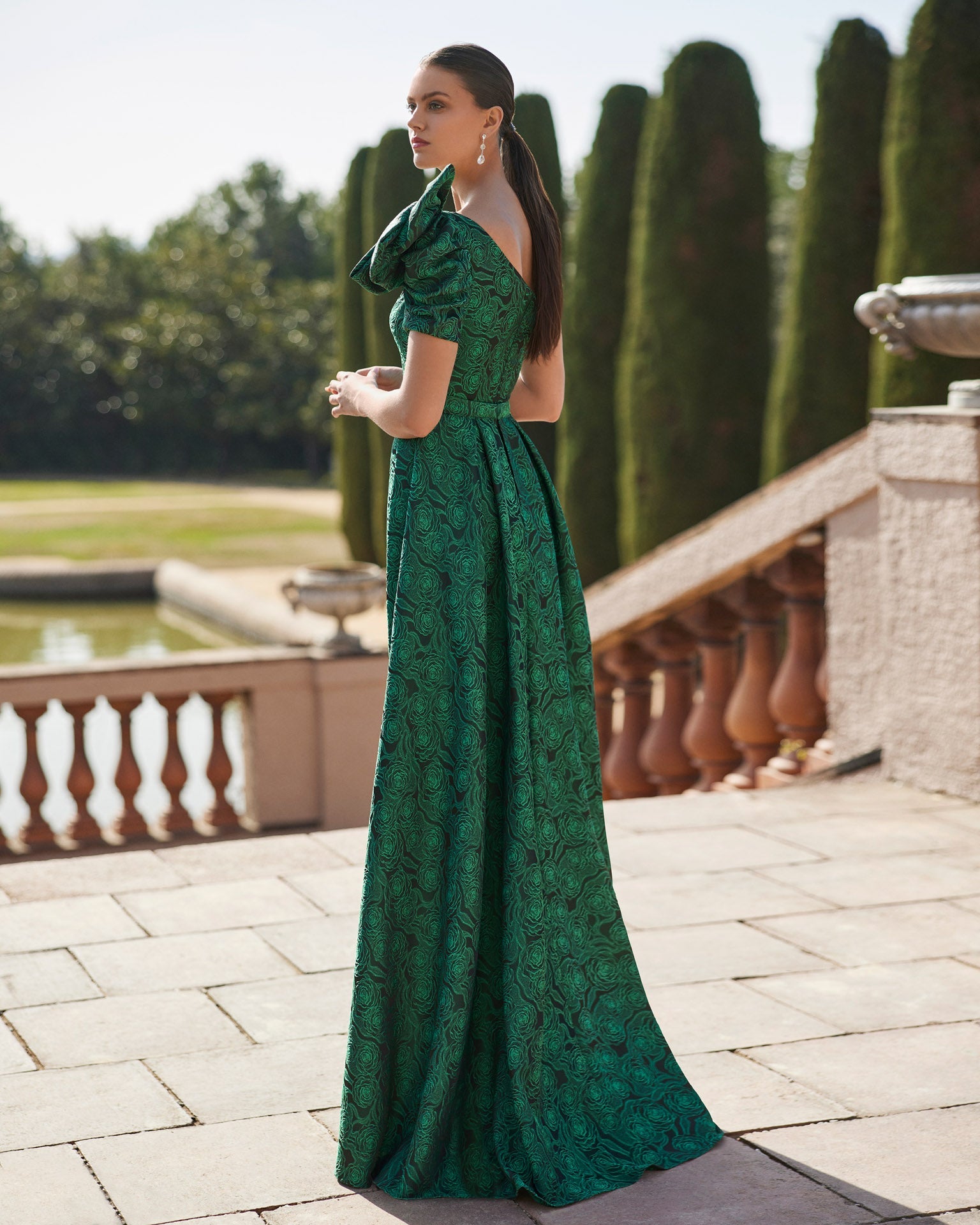 Long evening dress crafted in brocade. Featuring a bateau neckline, back zip, lace sleeve with feathers, and a decorative bow at the waist. A Marfil Barcelona look.