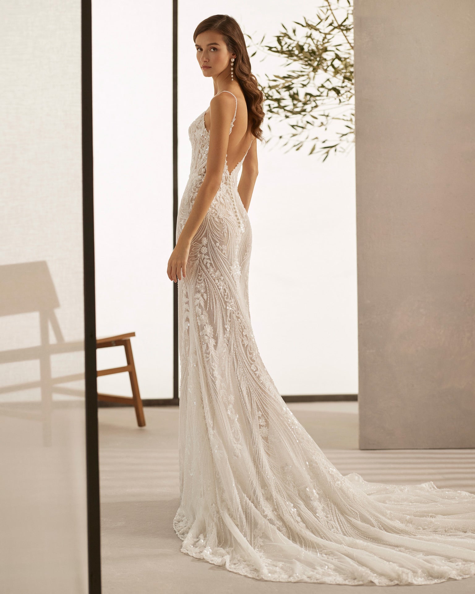 Elegant long mermaid wedding dress crafted in beadwork. Featuring a V-neckline, plunging back and beadwork straps. Showcase a delicate Rosa Clará Soft design.