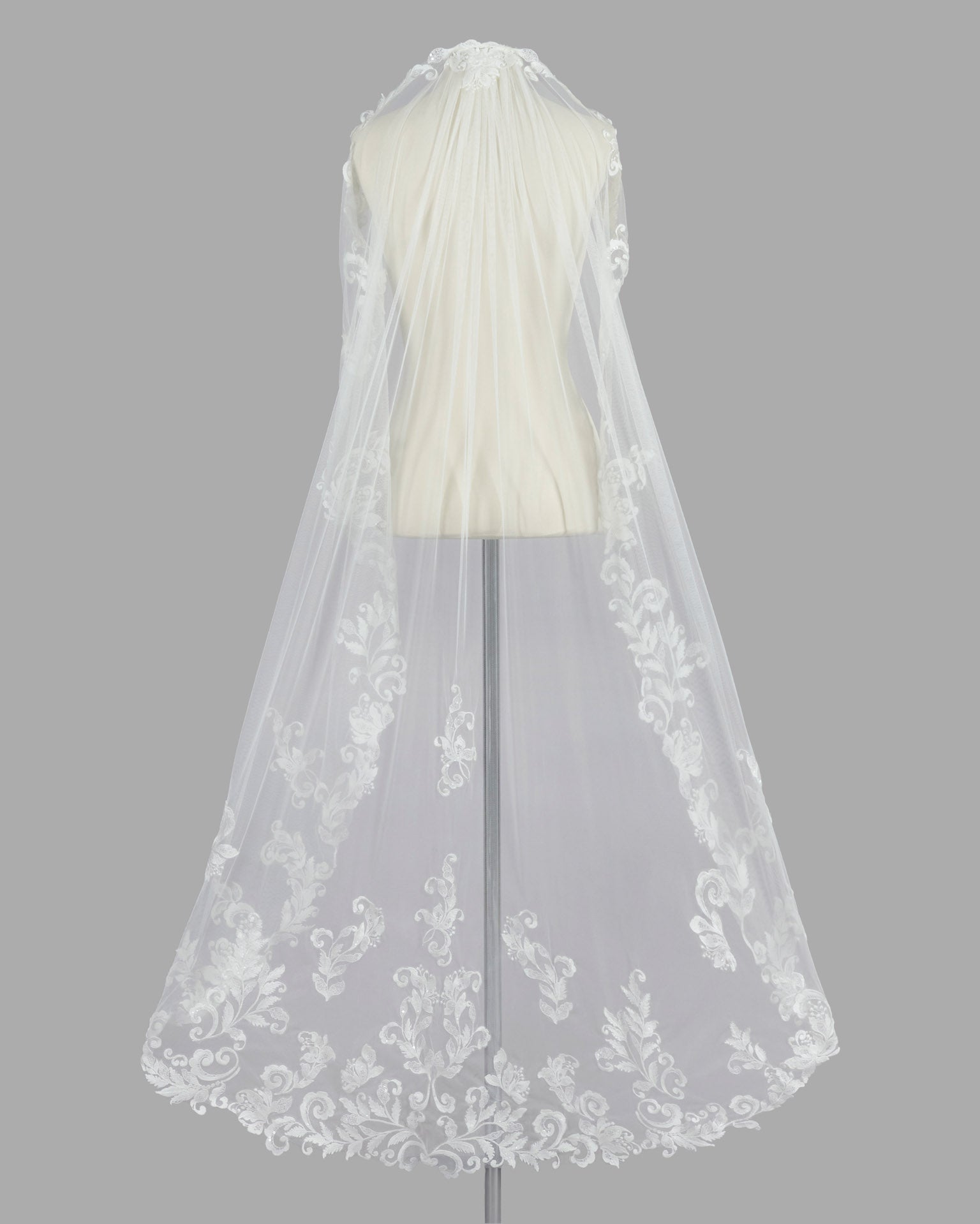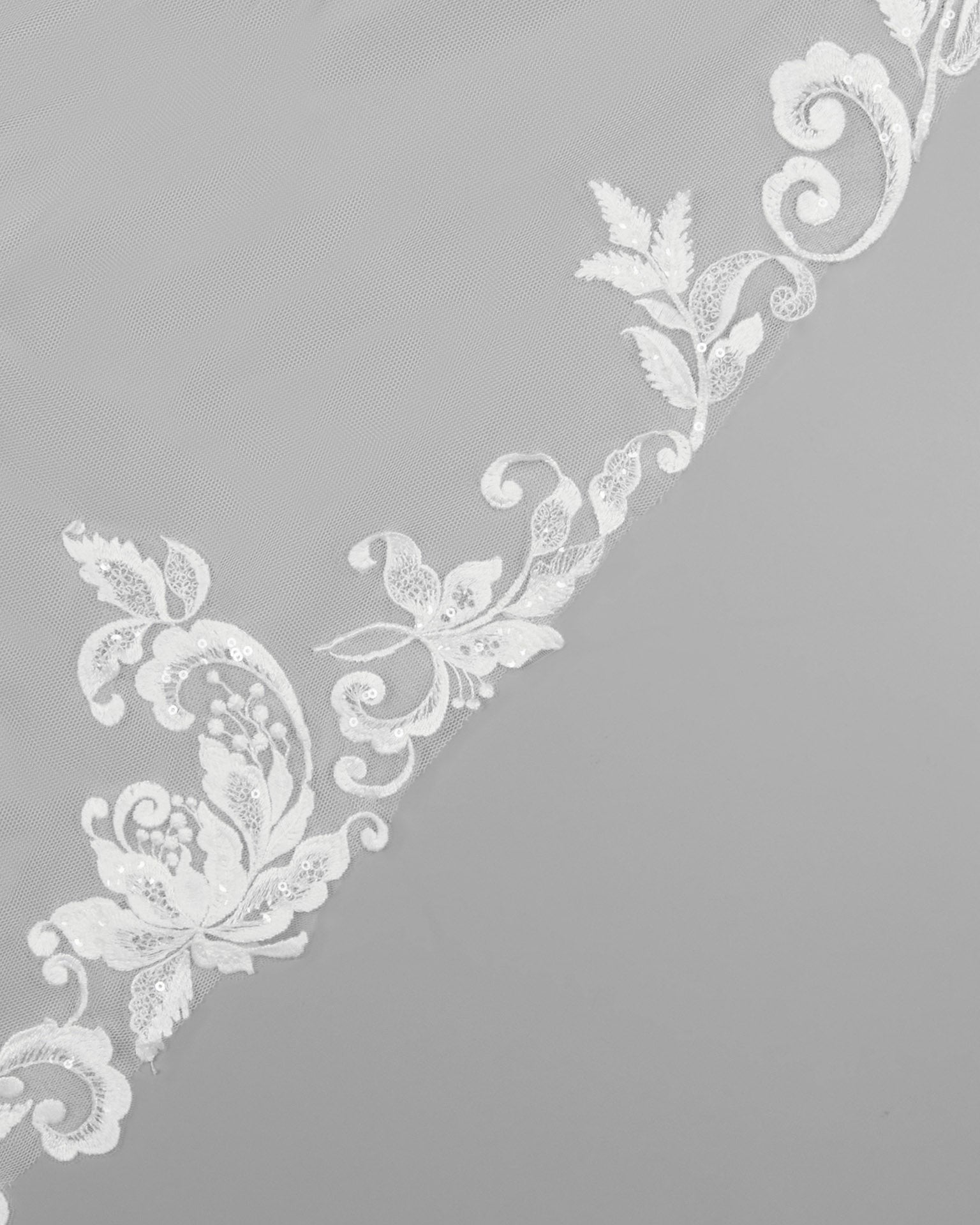 Tulle, lace, and beadwork bridal veil with comb and pearls.
