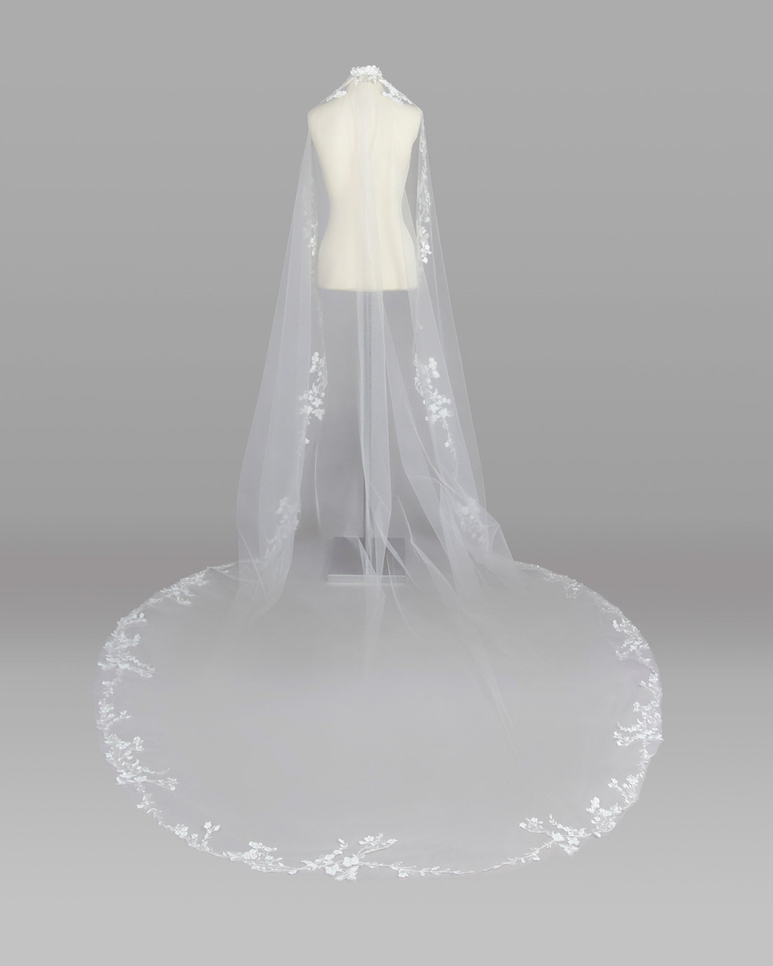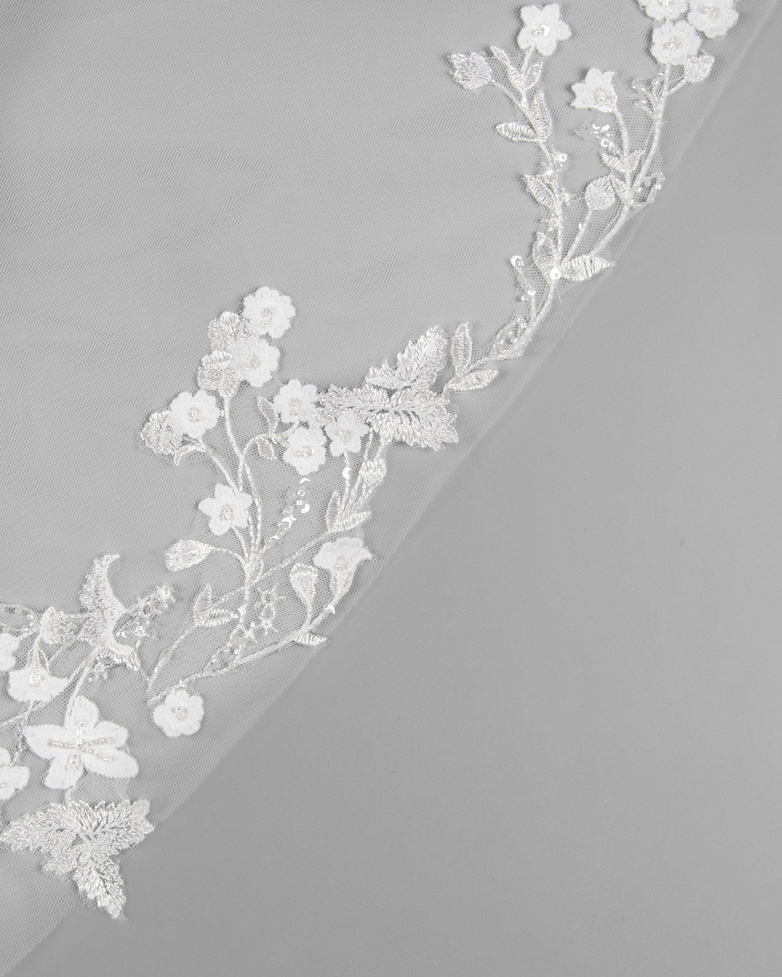 Tulle, lace, and beadwork bridal veil with comb and pearls.