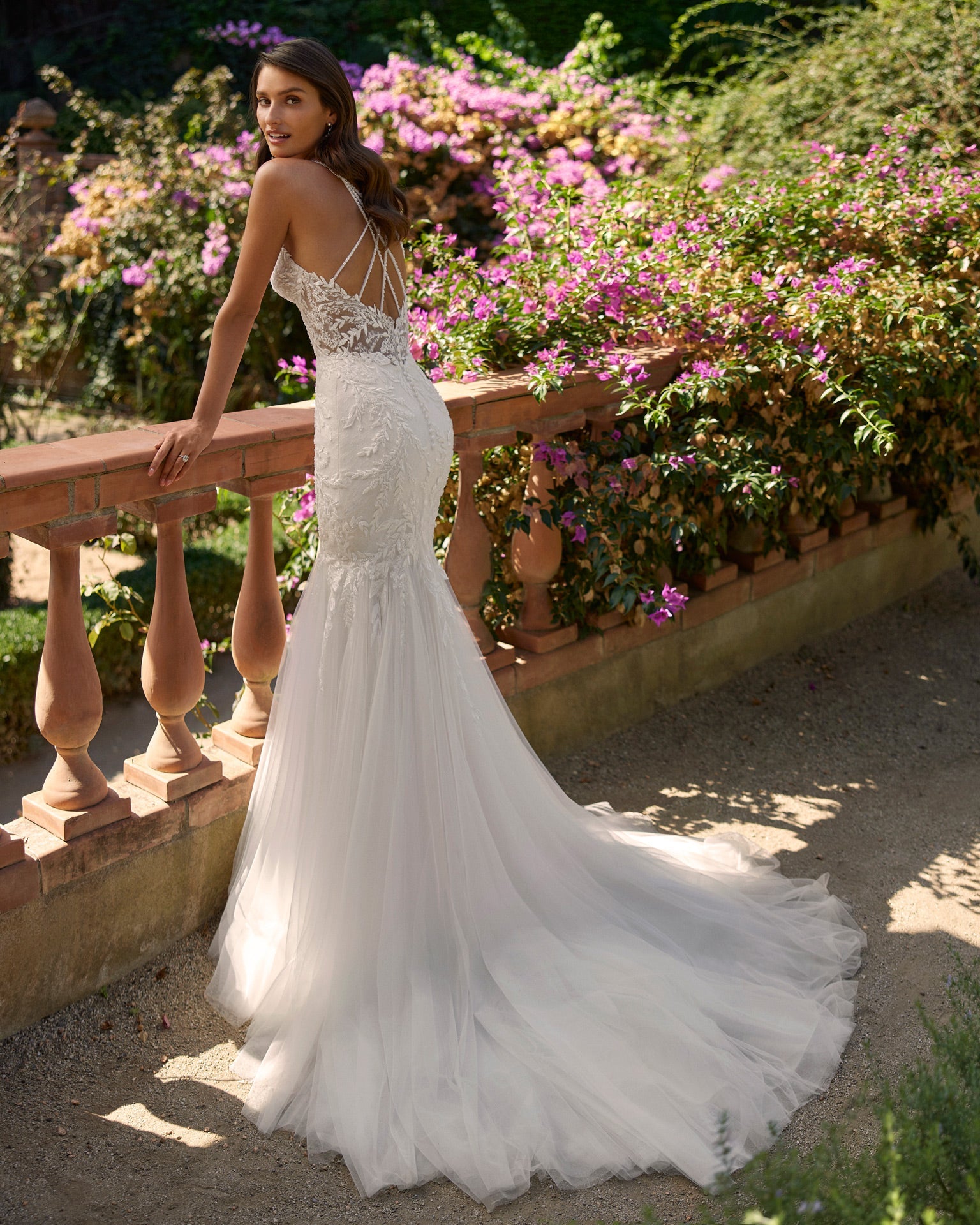 Romantic mermaid wedding dress made in lace, beadwork and tulle. Featuring a plunging neckline and back with crossed shoulder straps. An Adriana Alier bridal design.