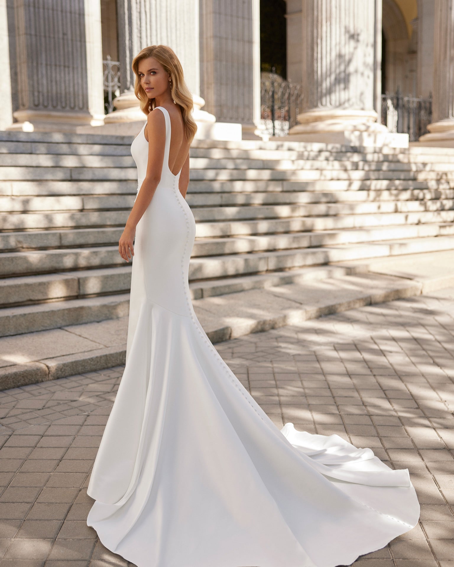 Sexy long mermaid wedding dress crafted in streetch mikado embellished with lace and beadwork. Featuring a square neckline, open back and straps. An on-trend Luna Novias design.