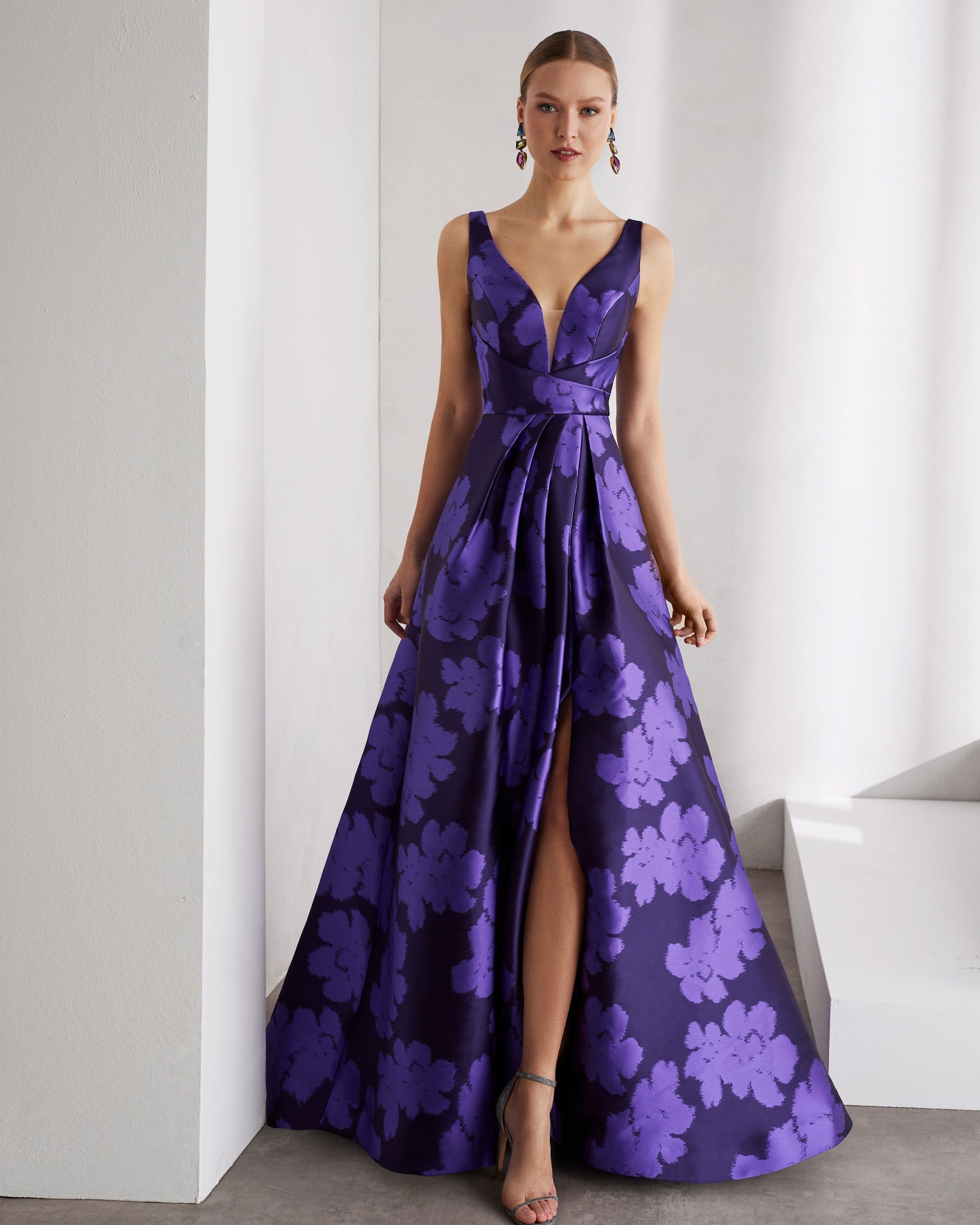 Long evening dress crafted in brocade. Showcase a V-neckline and V-back, straps, and a skirt with pockets. A Rosa Clará Cocktail look.
