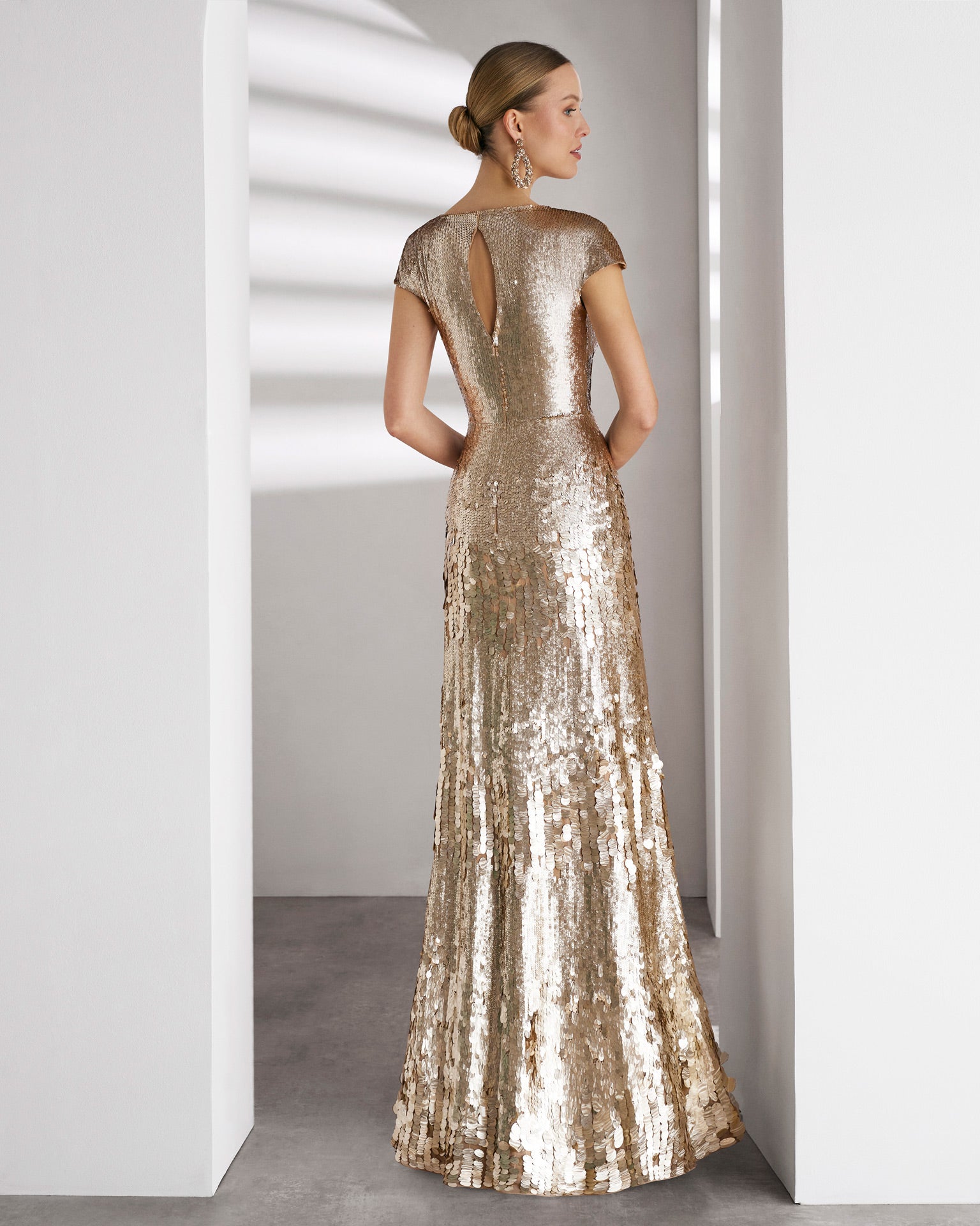 Long evening dress made in sequins. Featuring a bateau neckline, teardrop back and short sleeve. A Rosa Clará Cocktail look.