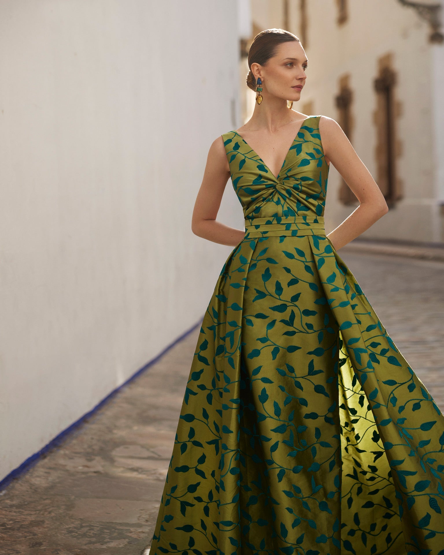 Classic long evening dress crafted in taffeta and embroidery. Featuring a V-neckline, V-back, straps and detachable taffeta overskirt. An Aire Barcelona look for parties and events.