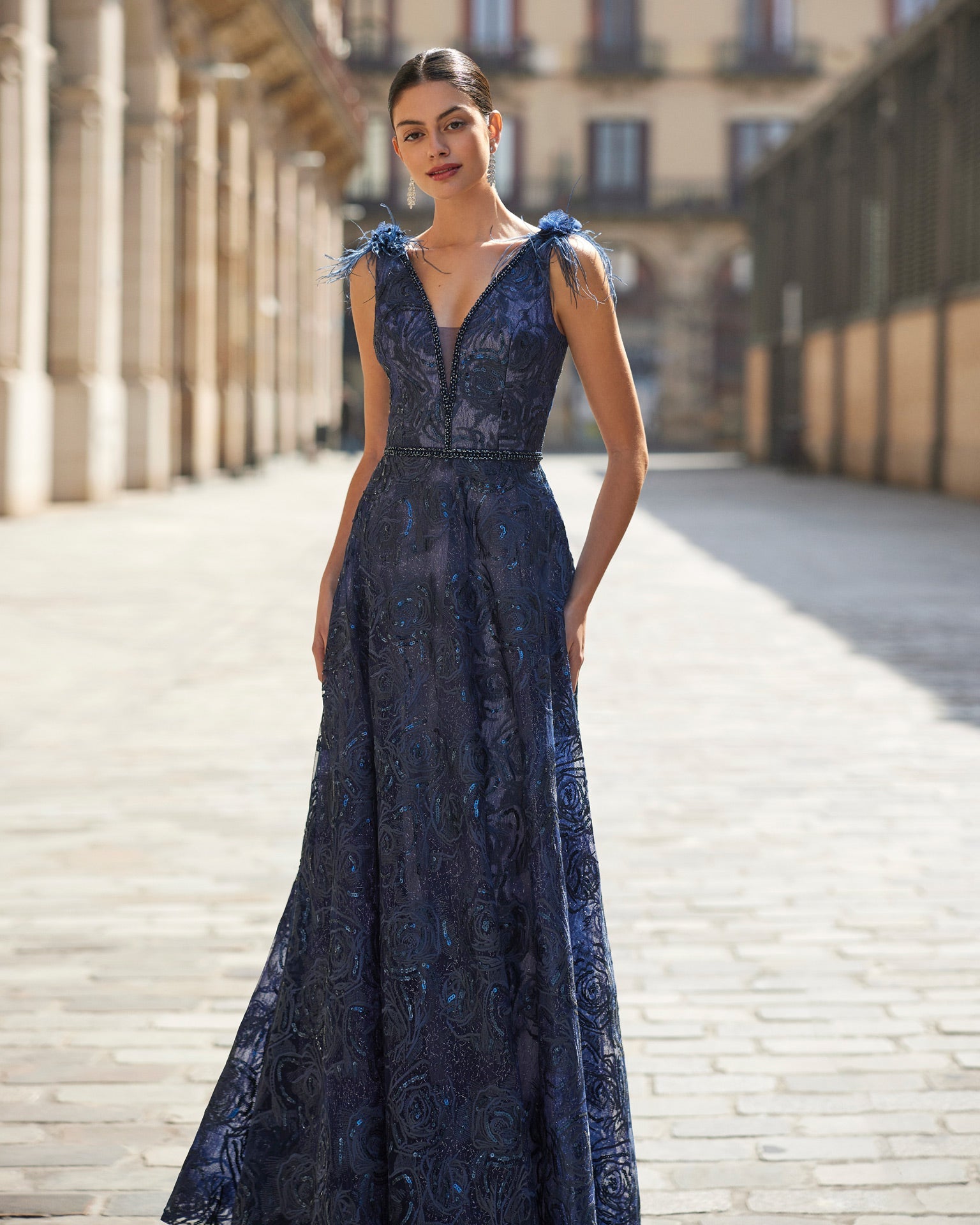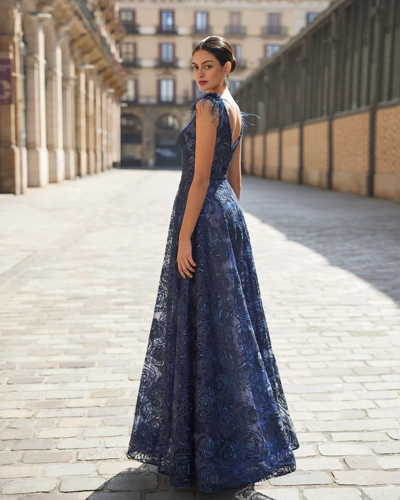 Fairytale style long evening dress. Crafted in tulle combined with beadwork lace. With V-neckline and back and straps with feathers. A dreamy Martha Blanc evening look.