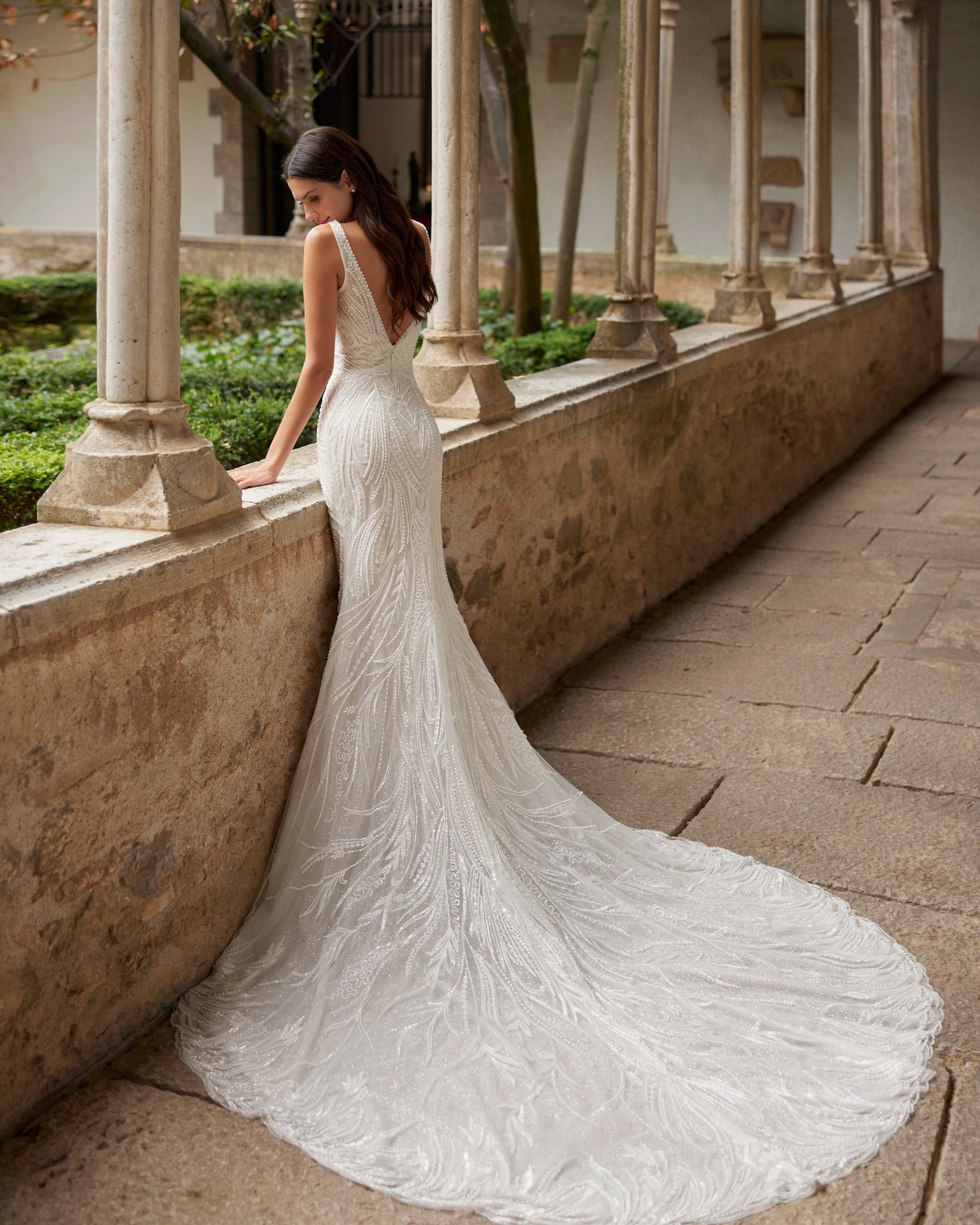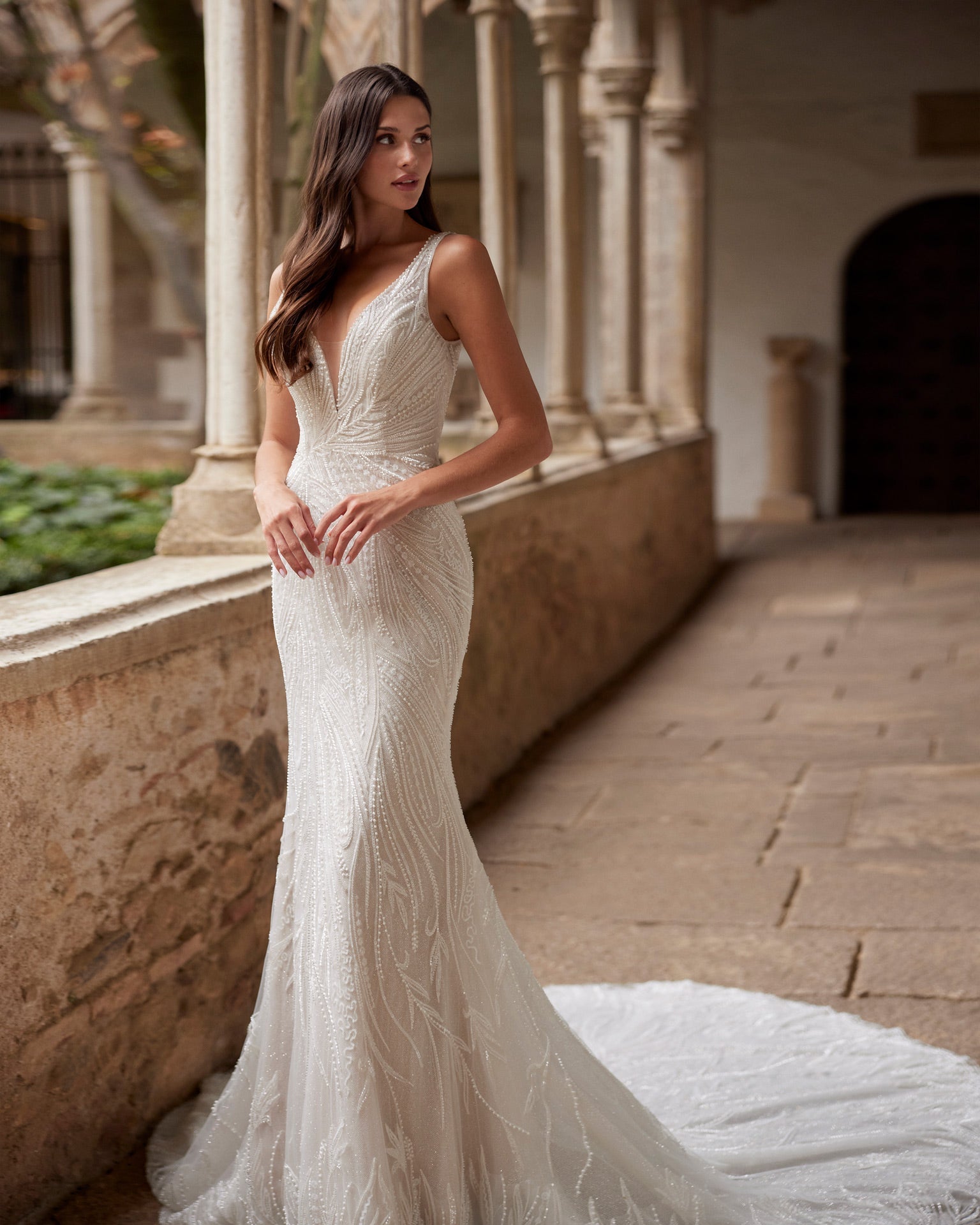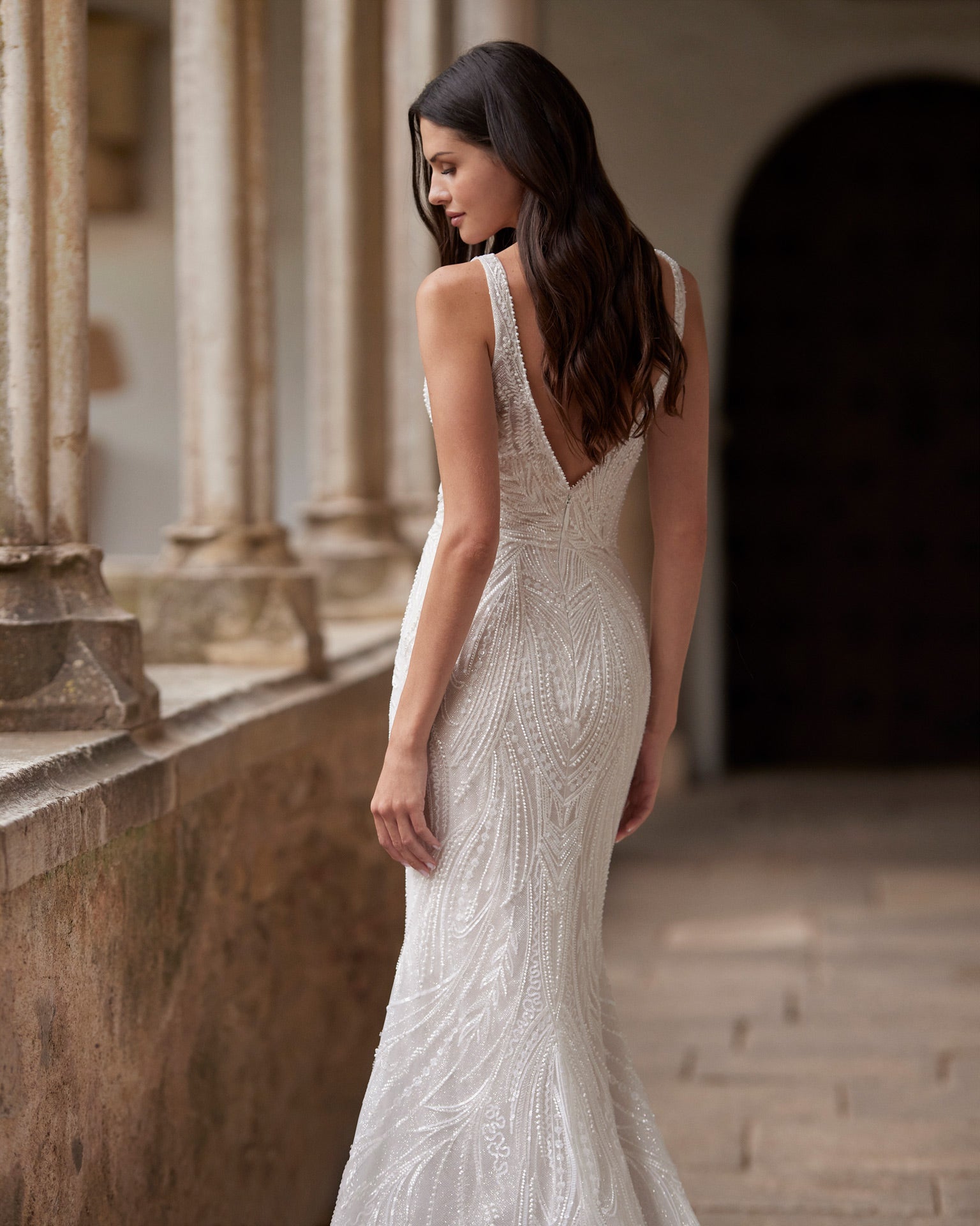 Sexy mermaid wedding dress. Made with beadwork. With V-neckline, V-back, straps On-trend Luna Studio design.