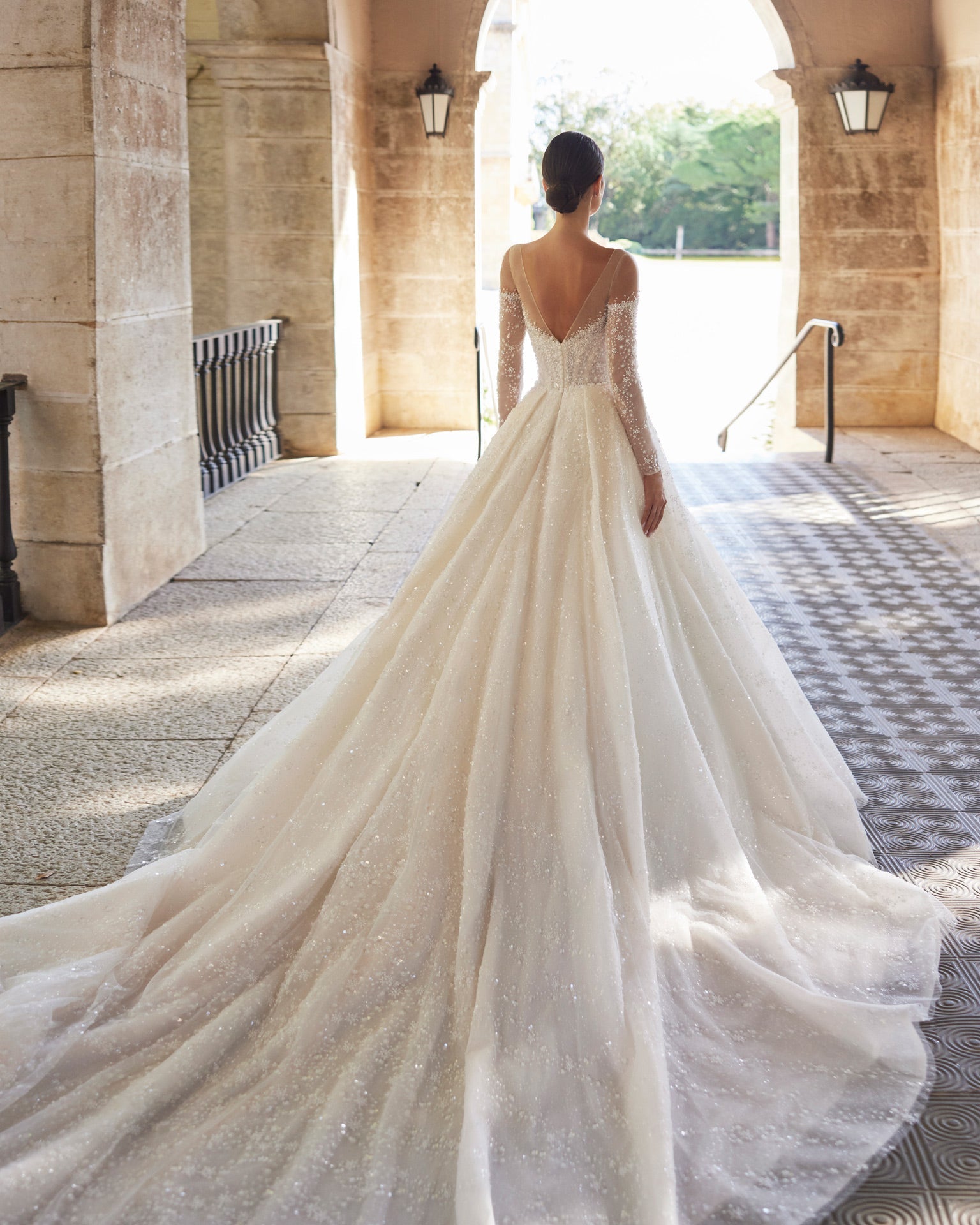 Fantasy style long wedding dress. Crafted in tulle combined with beadwork. With illusion neckline, illusion back and long sleeve Dreamy Luna Studio look.