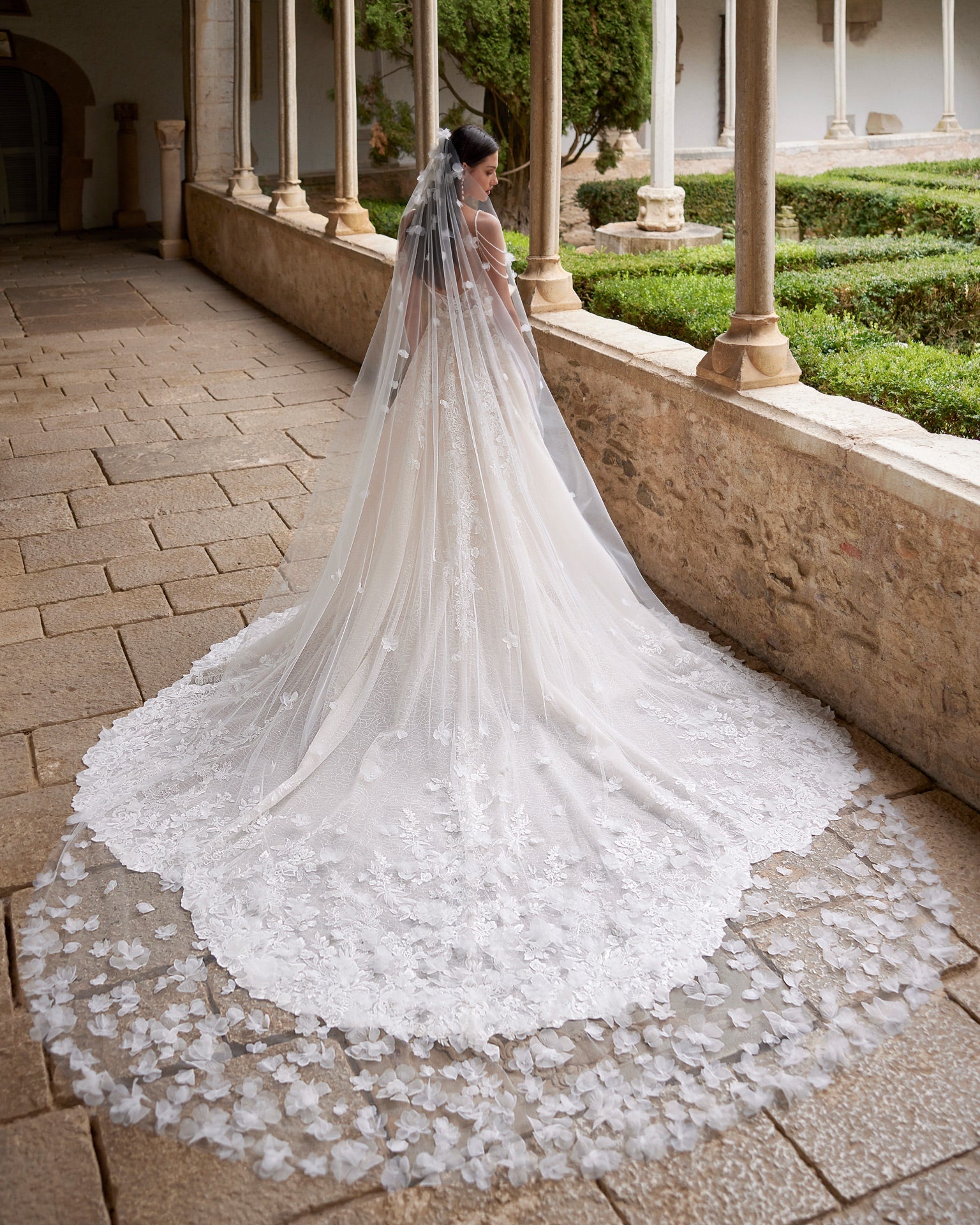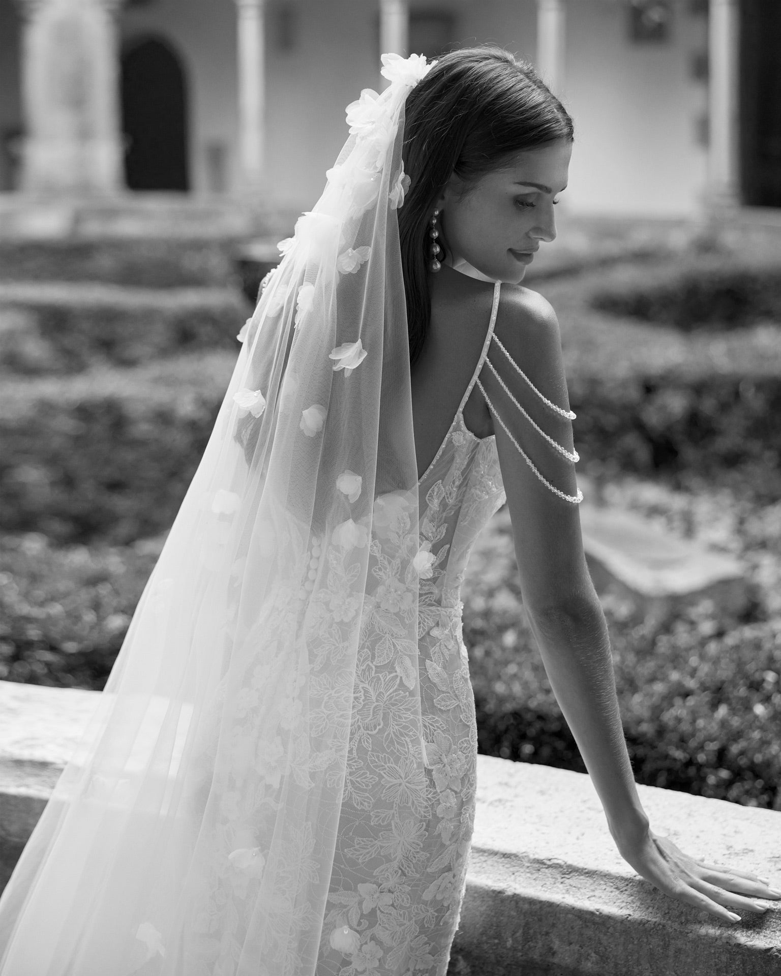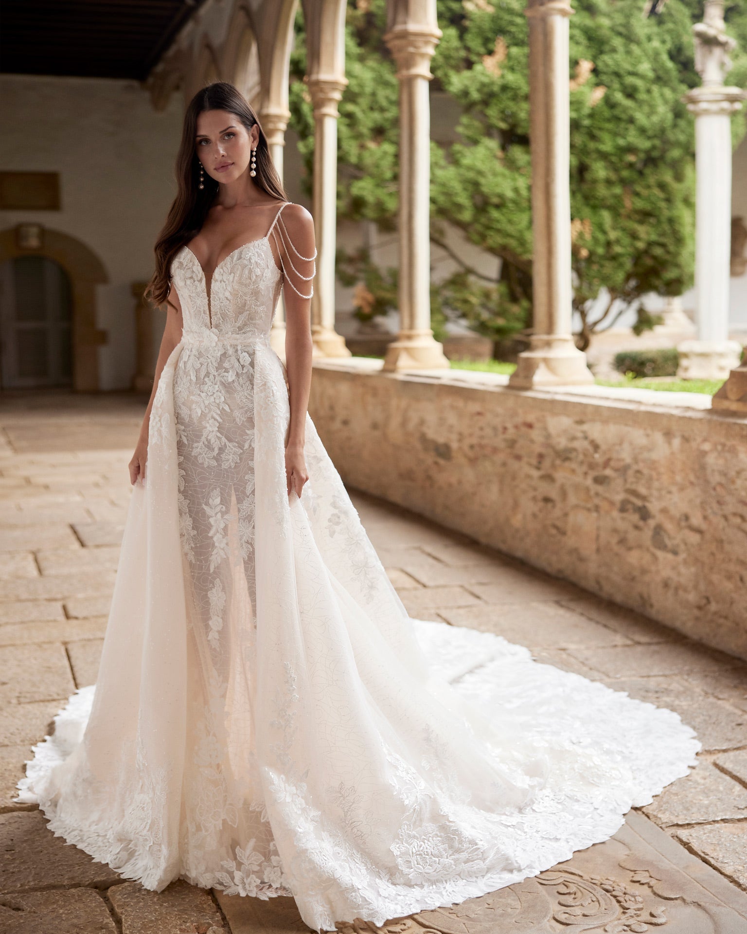 Romantic long two-piece mermaid wedding dress. Made with beadwork lace. With V-neckline, plunging back, beadwork straps and detachable overskirt. Dreamy Luna Studio set.