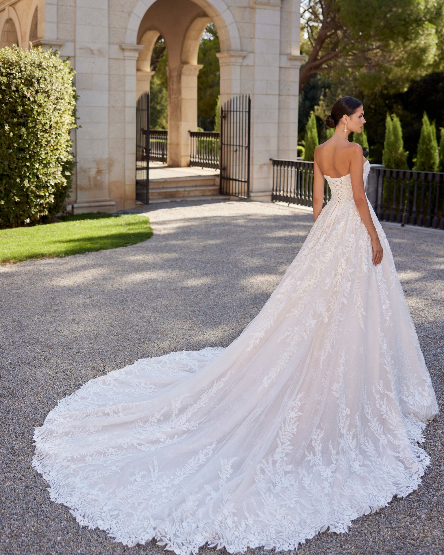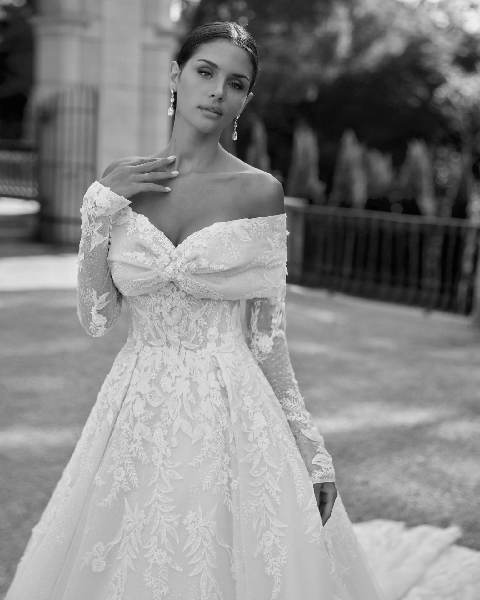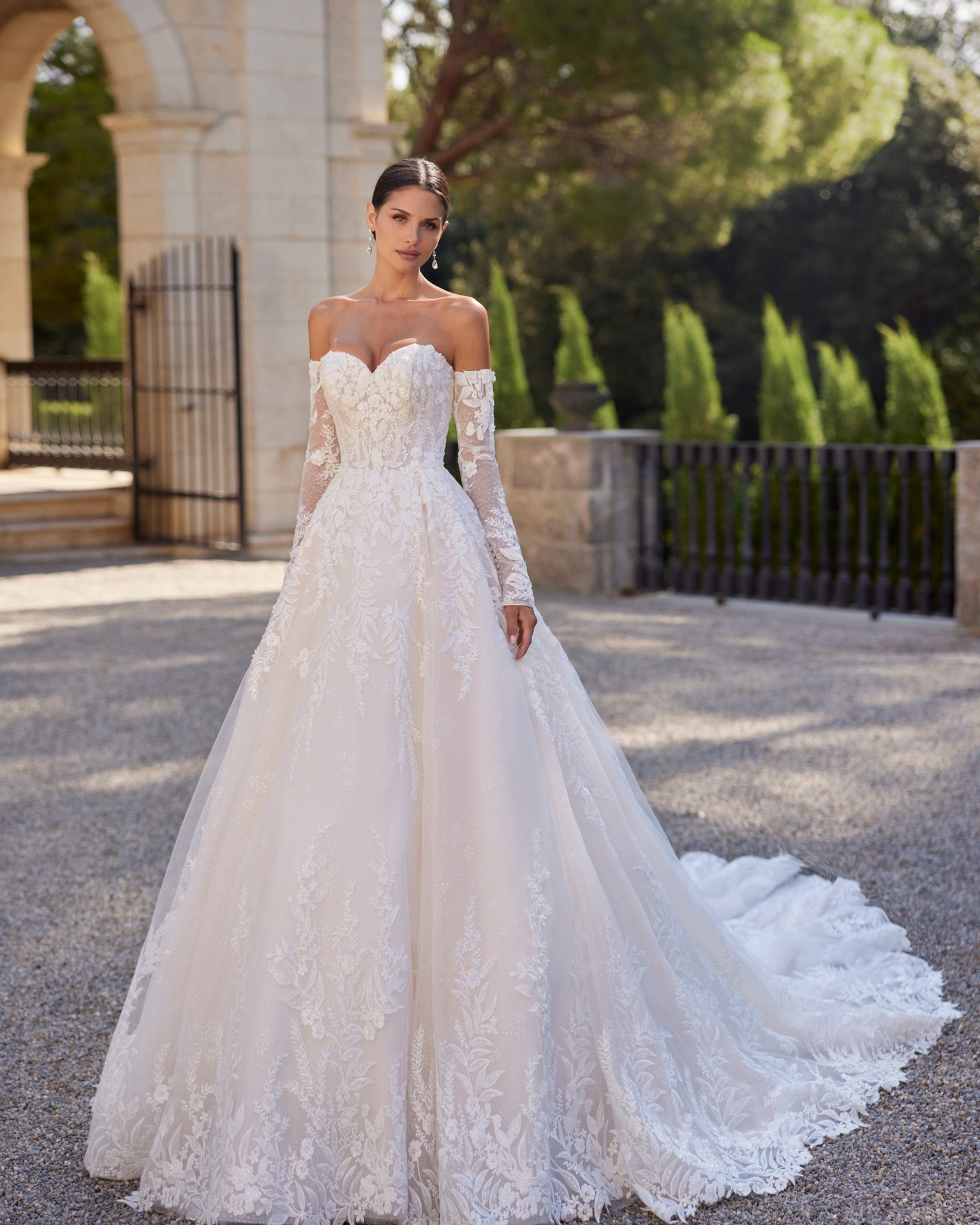 Classic long two-piece wedding dress. Crafted in tulle combined with beadwork lace. With sweetheart neckline, corset back and long detachable sleeve, paired with a detachable cuff neckline. Exclusive Luna Studio look.