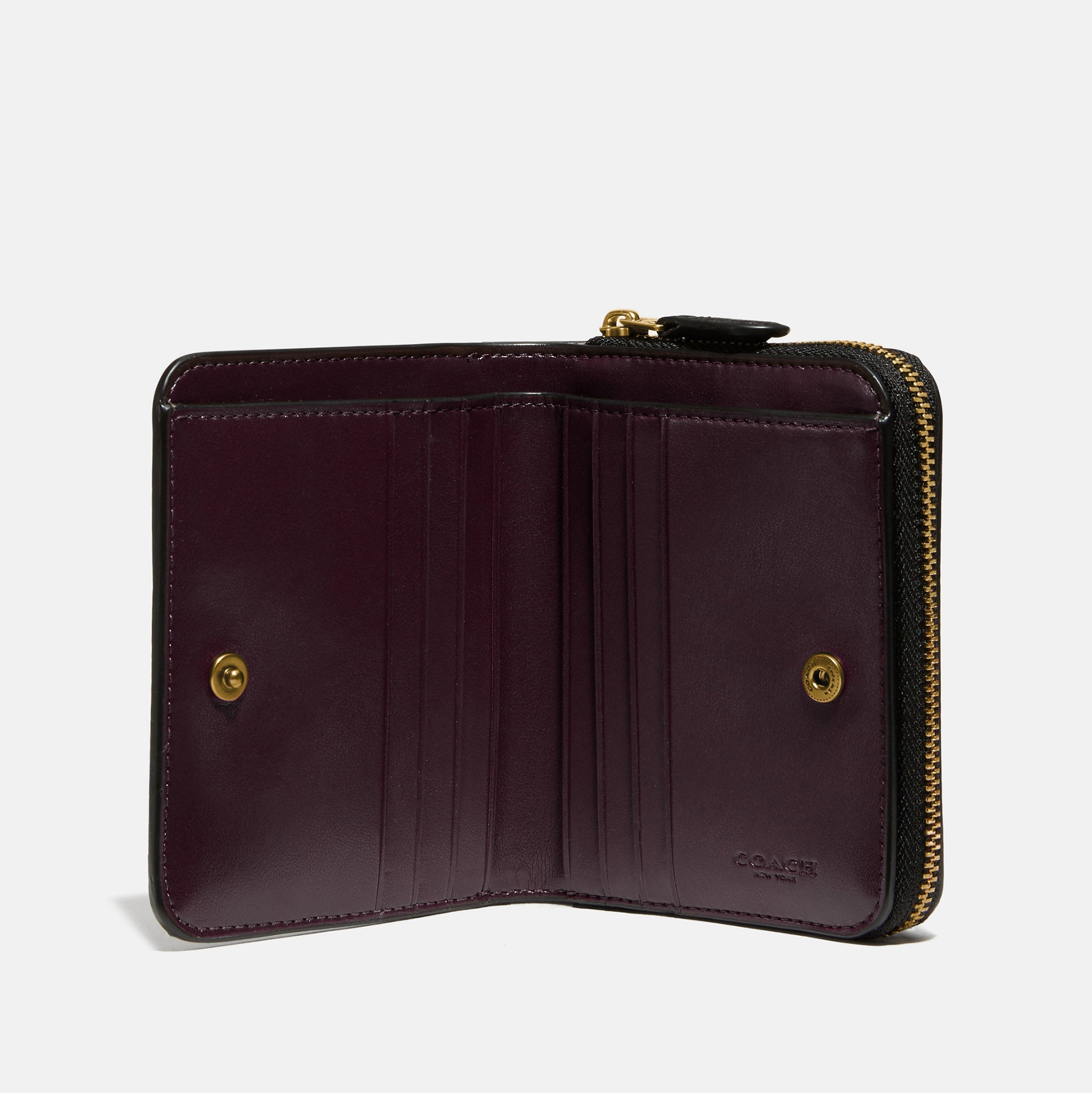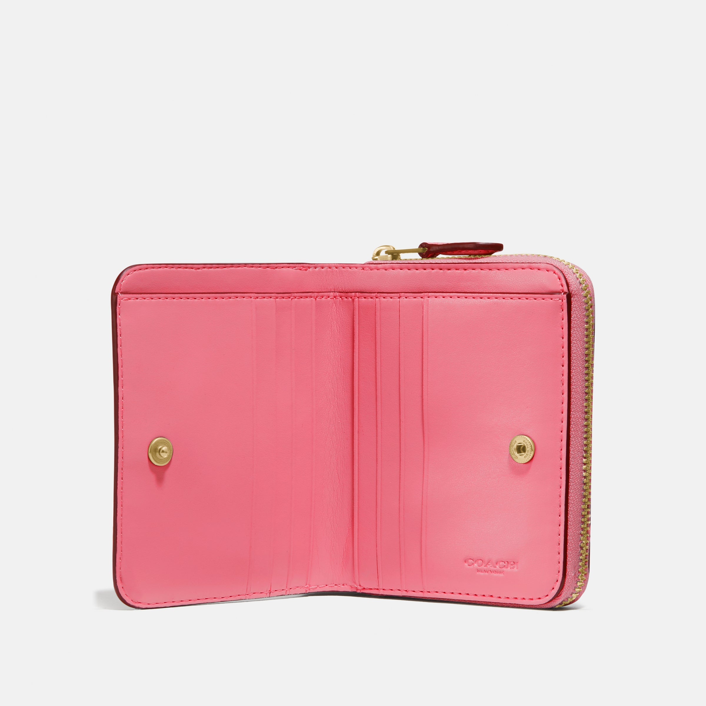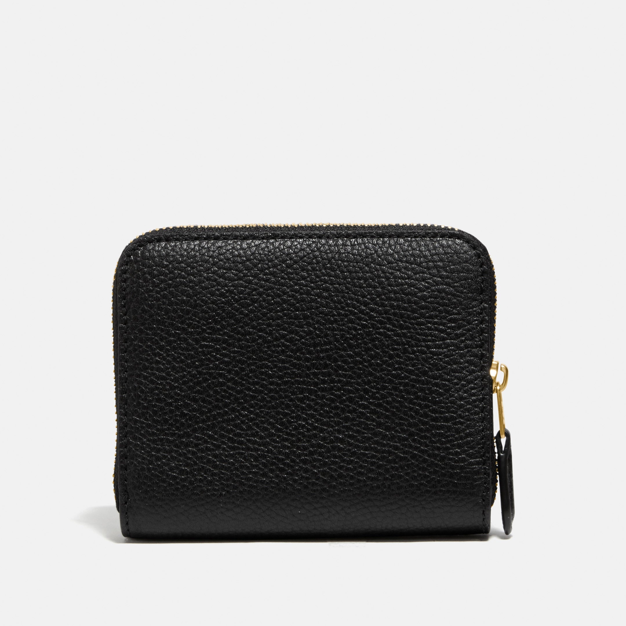 Crafted of polished pebble leather, this compact billfold wallet features a convenient exterior zip pocket for coins, receipts, earbuds and other small essentials. It unsnaps to reveal six card slots and a full-length bill compartment.
