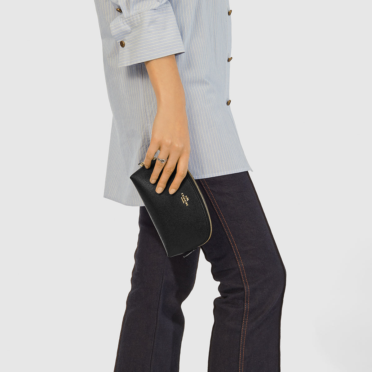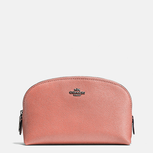 Keep makeup and other small essentials stylishly organized in this petite cosmetic case. It’s crafted from sturdy crossgrain leather with polished metal hardware.