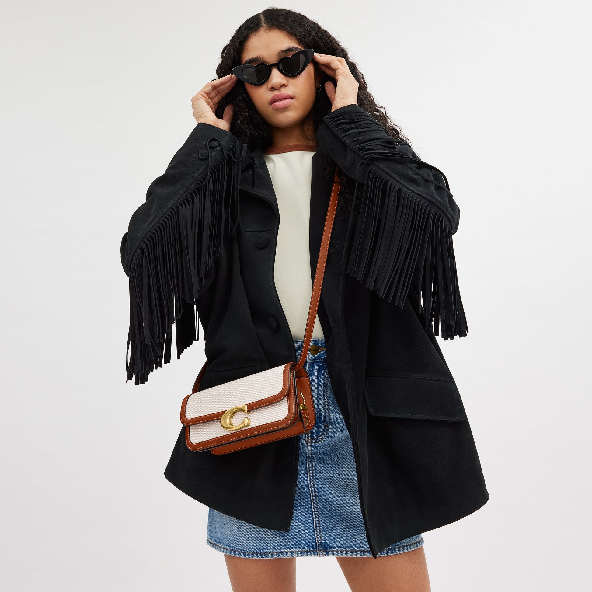 | Features | Canvas and glovetanned leather Inside zip and snap pockets Magnetic snap closure, leather lining Outside open pocket |