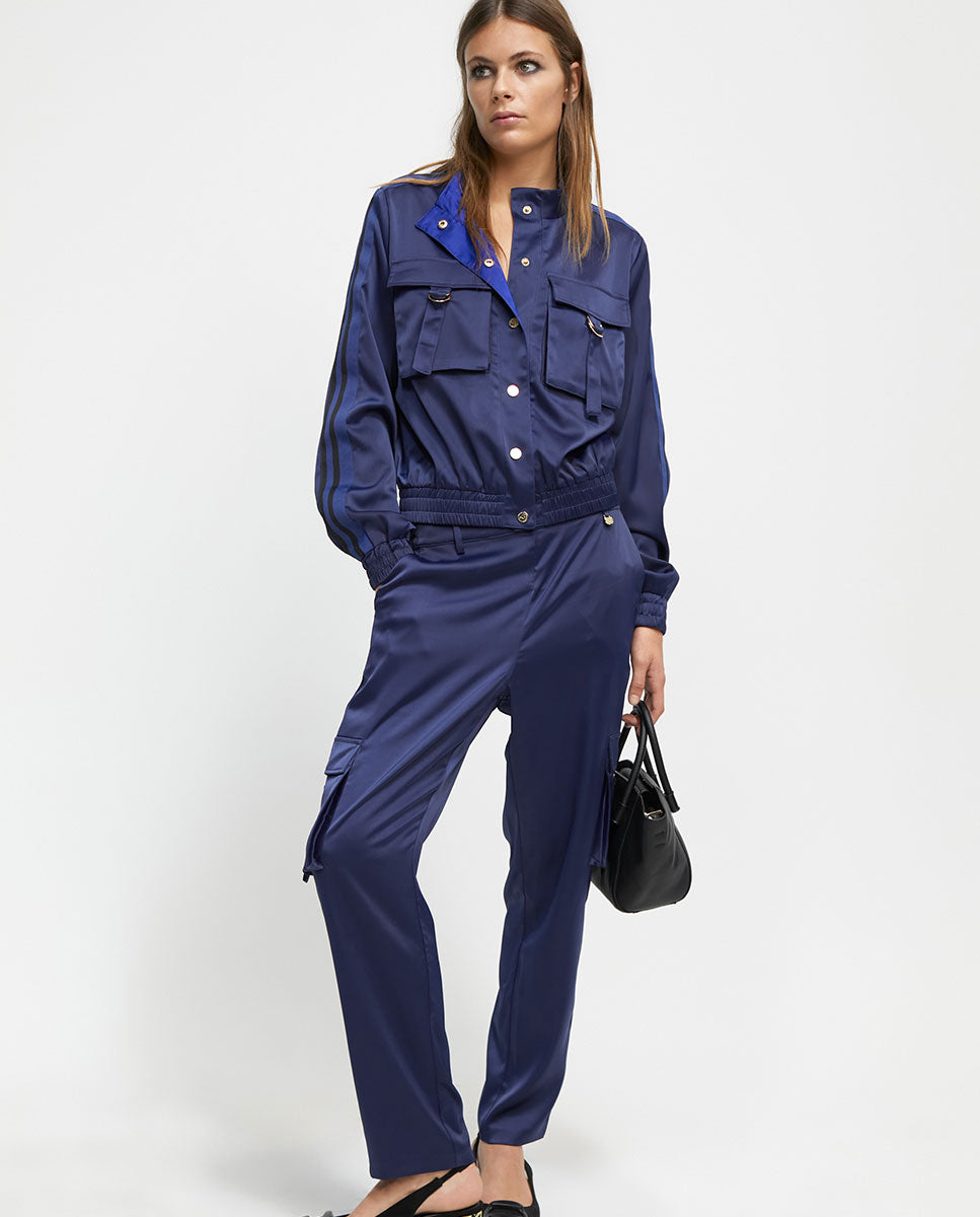 Satin bomber jacket Front patch pockets with flaps and a metal buckle. Sporty stripe detail on the sleeves. Metal snap-button fastening. Elasticated hem.