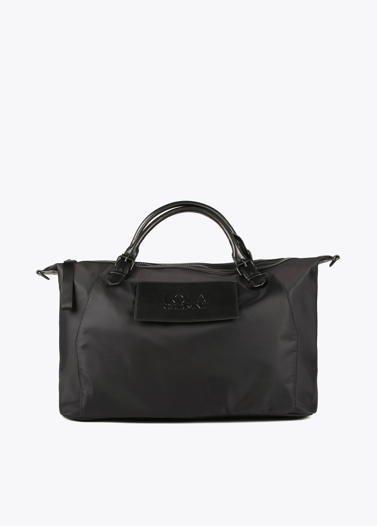 Black weekend bag in contrast nylon and faux leather. Pocket and logo on the front. Handles and crossbody strap with logo. Zip fastening and inner compartments.