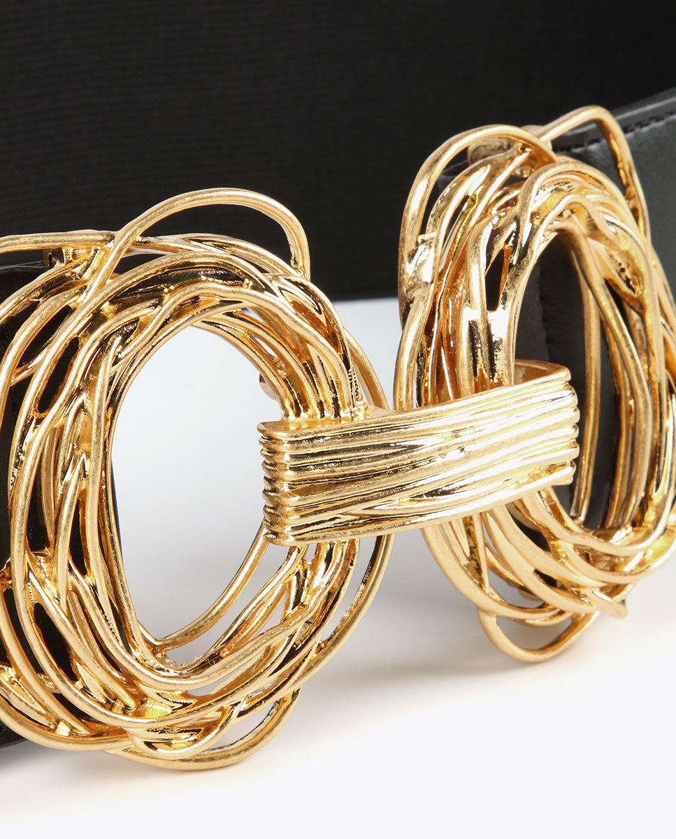 Stretch sash belt with fastening featuring two golden multi-hoop pieces.