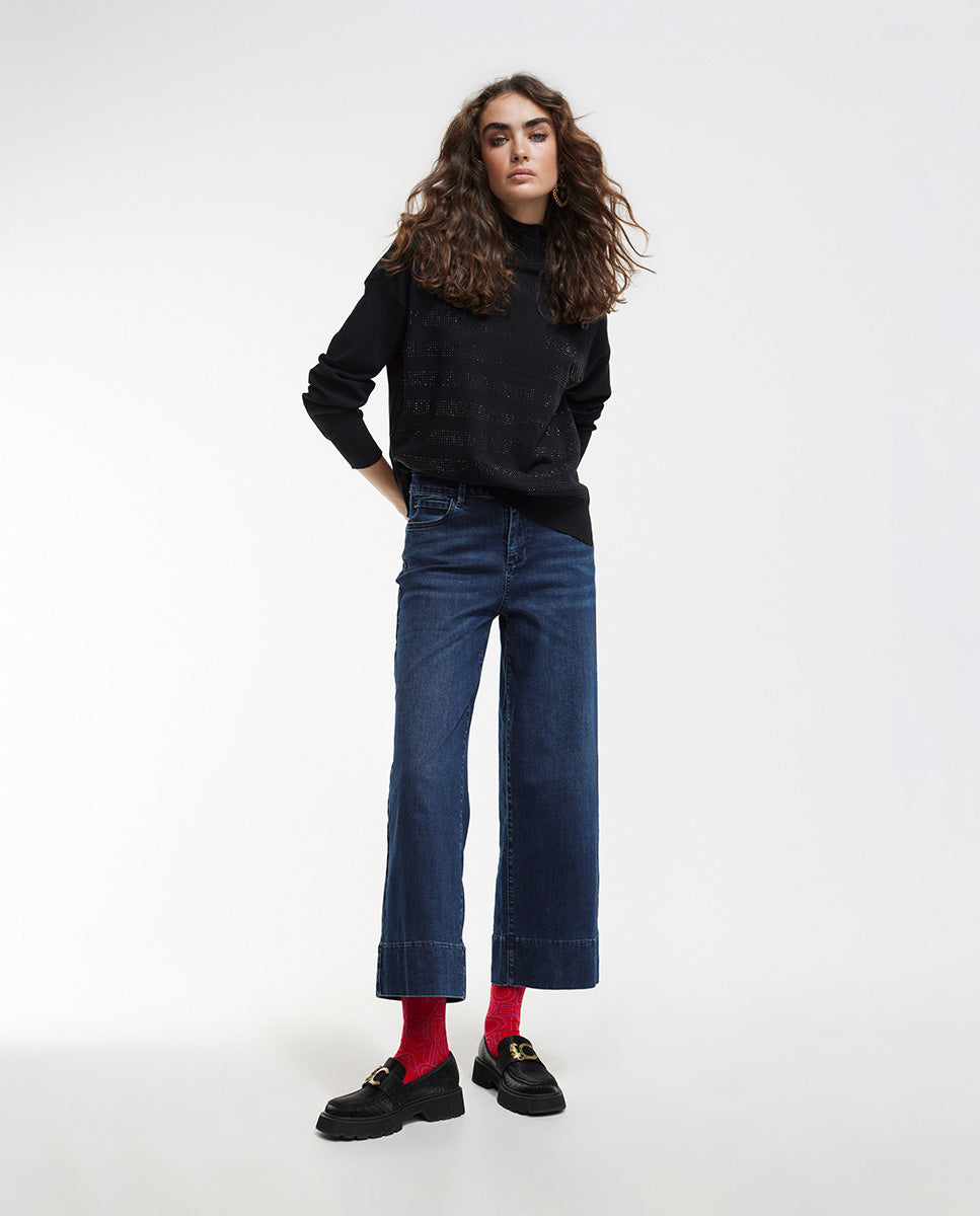Mock neck sweater with long sleeves. Matching rhinestone detail in horizontal lines on the front.