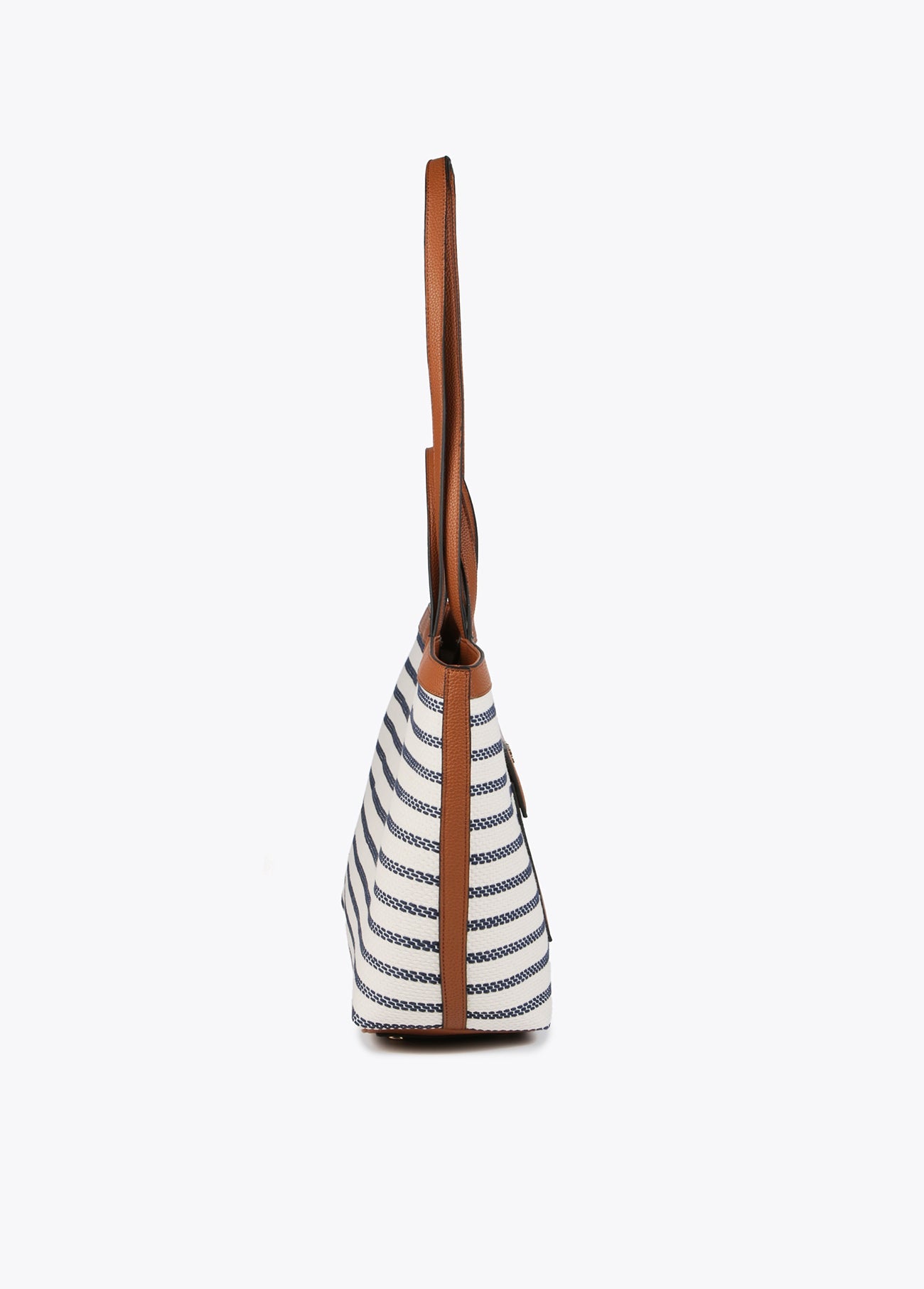 Tote bag with contrast striped fabric and brown faux leather. Features an inner pouch and outer pocket. Magnetic closure. HEIGHT: 28 cm - LENGTH: 39 cm - WIDTH: 14 cm / CROSSBODY BAG: 35 cm