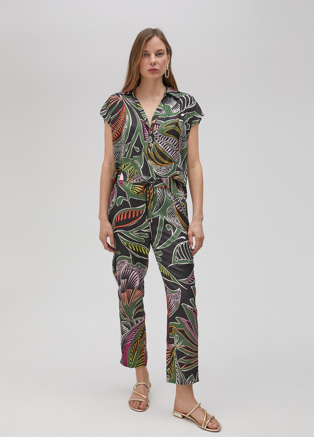 Floral print joggers in a floral print on a black background with elasticated waistband and drawstring belt.