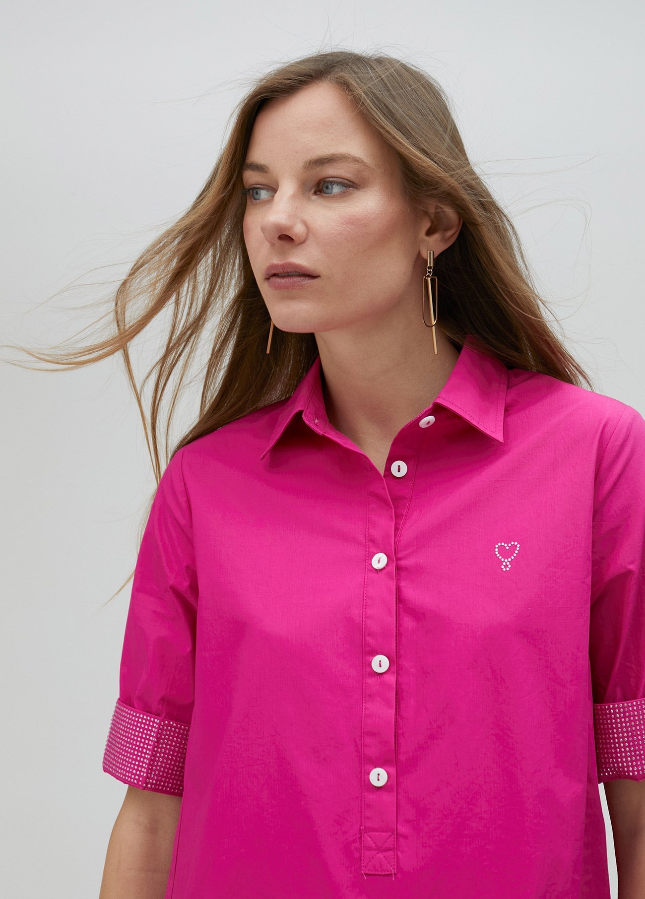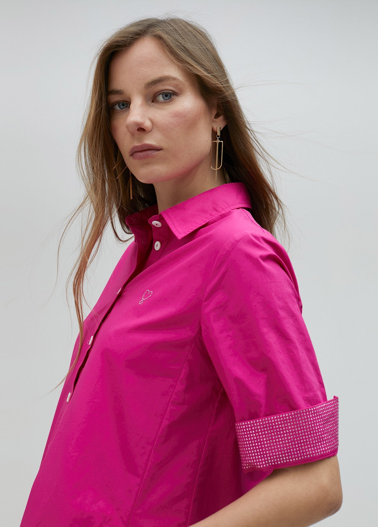 Short shirt dress with matching rhinestones on the sleeves, side pockets and a pleat at the back.