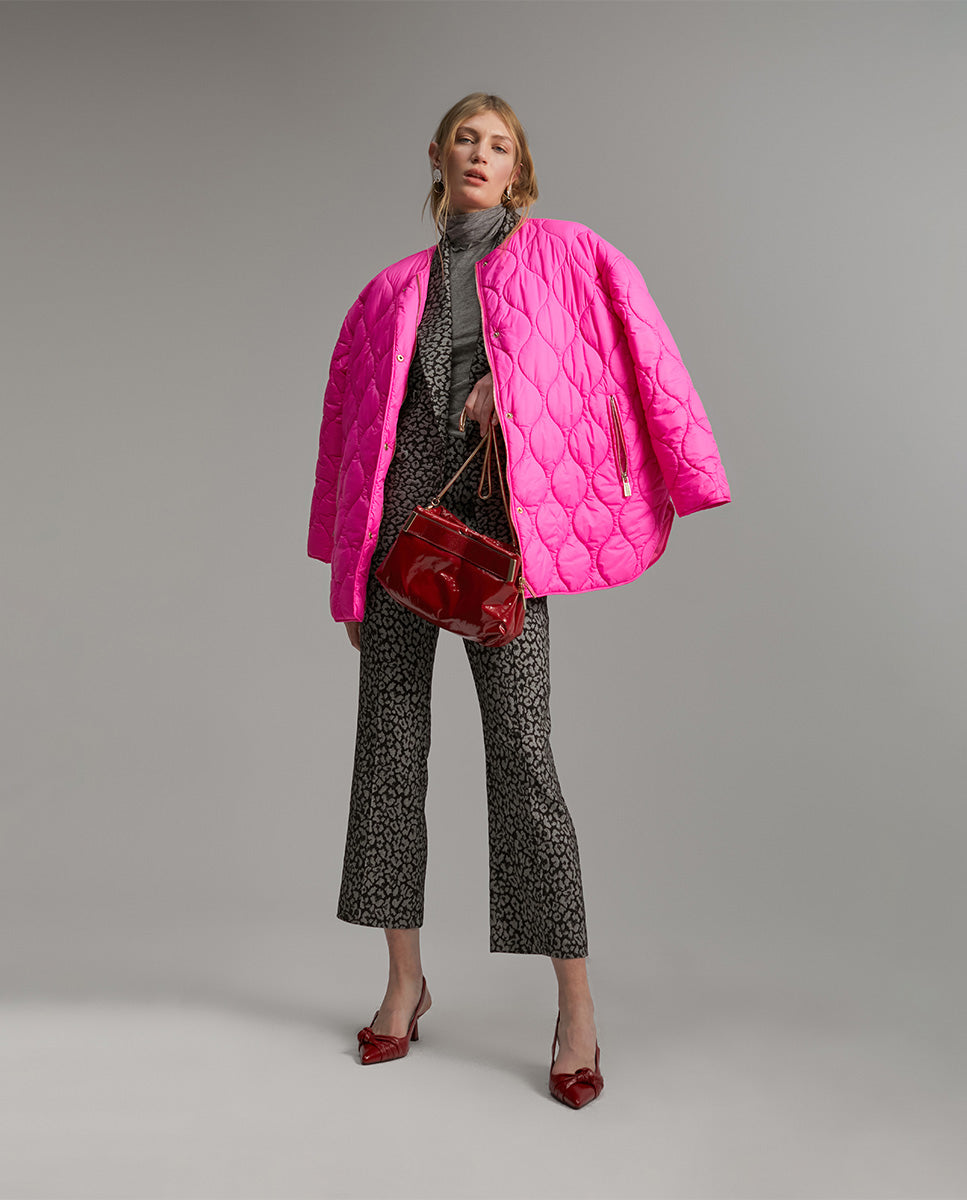 Padded jacket with round neck. Metal snap-button and two-way metal zip fastening. Side pockets with zip fastening. Side vents at the hem.